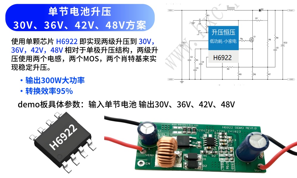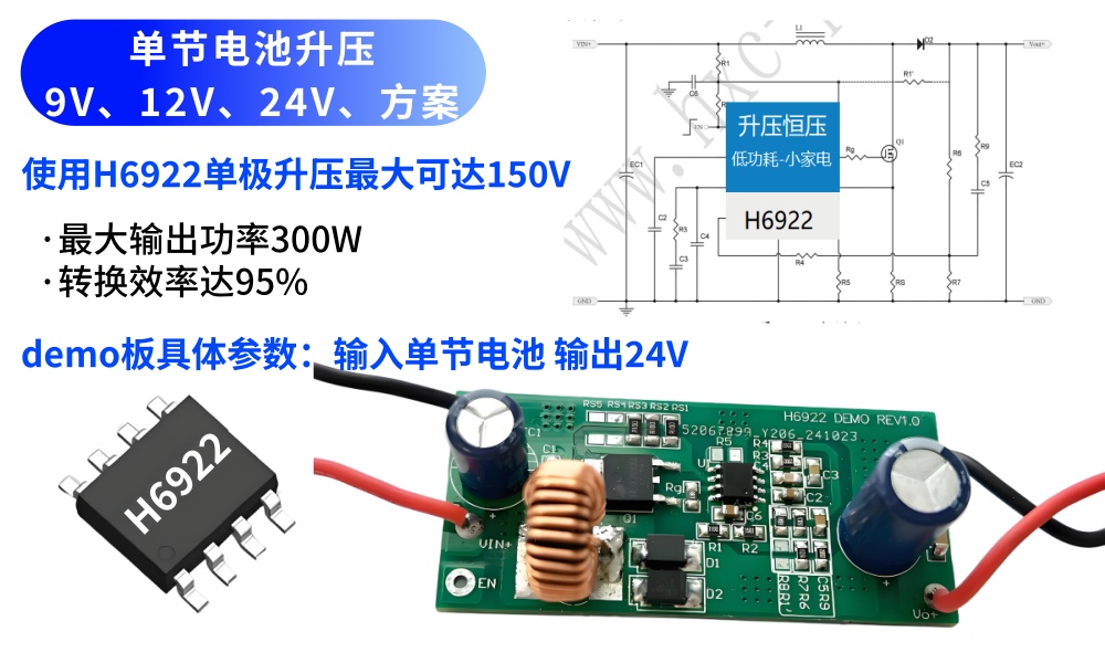H6922 单级升压方案,可实现最高 150V 输出,能够提供 300W 功率且转换效率达 95%。这种方案适用于对电压需求较低的场景,如一些小型户外传感器供电等,具有较高的效率和稳定性,能有效减少能源损耗,延长设备的工作时间。