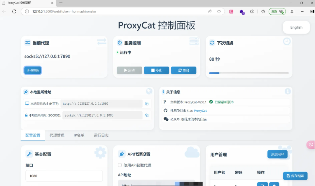 port = 1080 本地代理监听端口web_port = 5000 Web 管理端口mode = cycle | loadbalance 代理切换模式interval = 300 代理更换间隔(秒)check_proxies = True 是否启用有效性检测token = honmashironeko Web 管理访问令牌[Users] 用户认证组,格式 账号=密码启动: