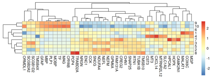 我们可以将选定的标记基因可视化为热图(显示聚类水平的平均表达):