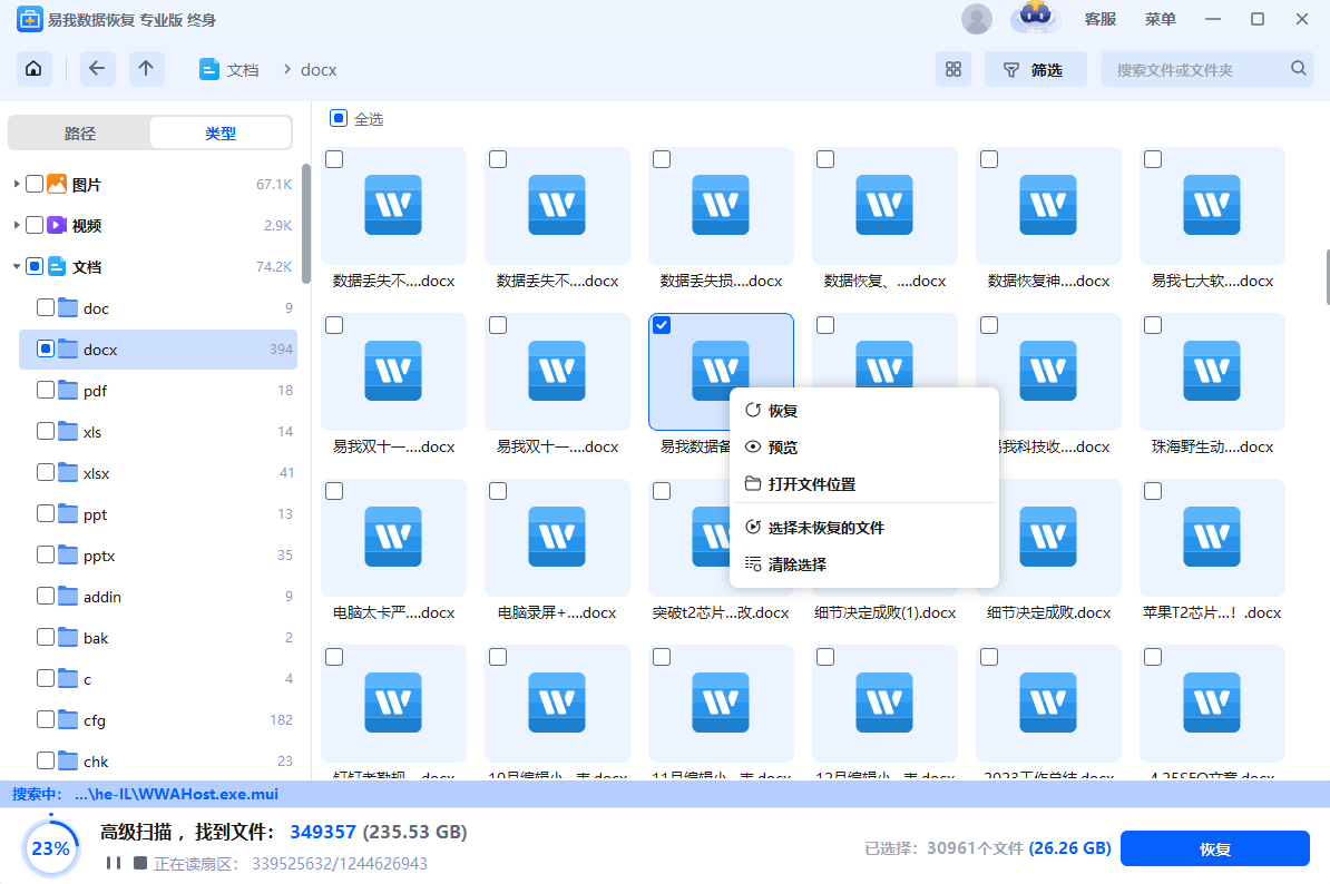 步骤2.软件开始扫描D盘并逐一罗列出文件数据,可以通过路径、类型、筛选、搜索框快速查找文件数据。在扫描过程中,还可以对扫描出的文件进行免费预览,以确认是自己需要恢复的文件。