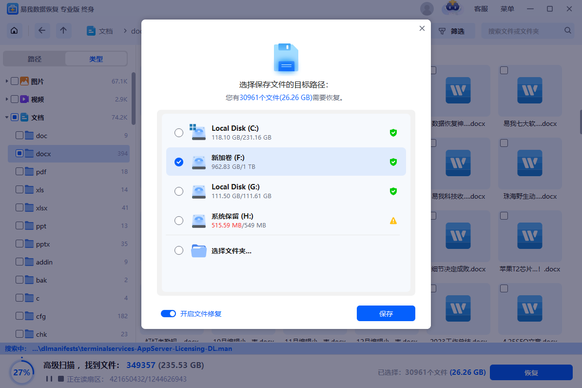 步骤3.选中需要恢复的文件数据后,点击“恢复”,选择需要保存的位置(注意不要保存到源盘D盘,避免数据被覆盖),并“开启文件修复”(软件在保存过程中恢复自动修复损坏的文件),随后点击“保存”。