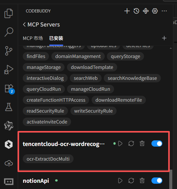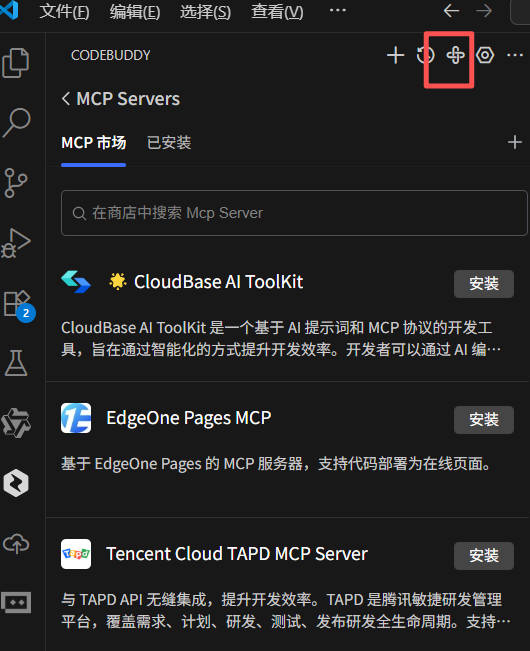 我们到VS编辑器中codebuddy插件处快速安装MCP。