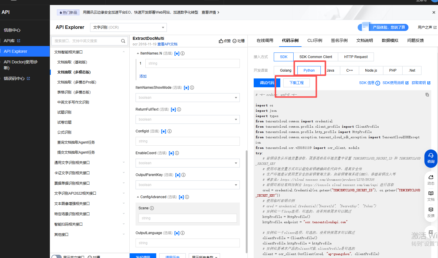 可以选择python语言下载工程代码到本地IDE进行测试。