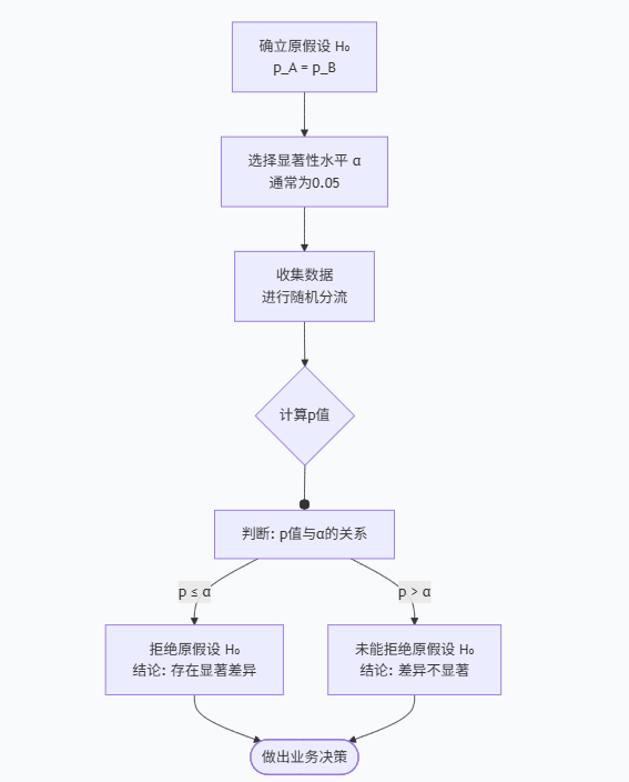 | p-value > α | 未能拒绝原假设 (Fail to Reject H₀) | 没有足够证据表明A/B两组存在差异 |