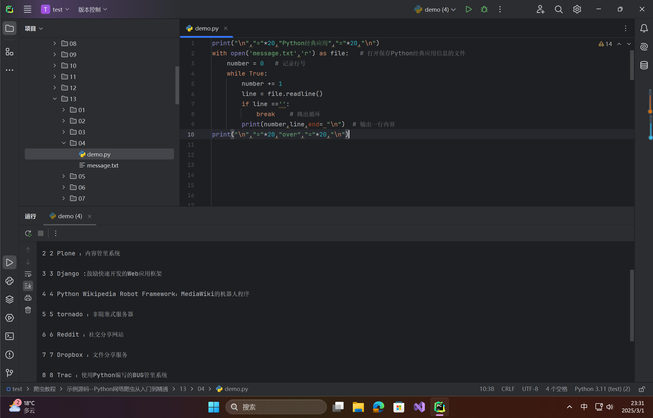 with open('message.txt','r') as file: # 打开保存Python经典应用信息的文件