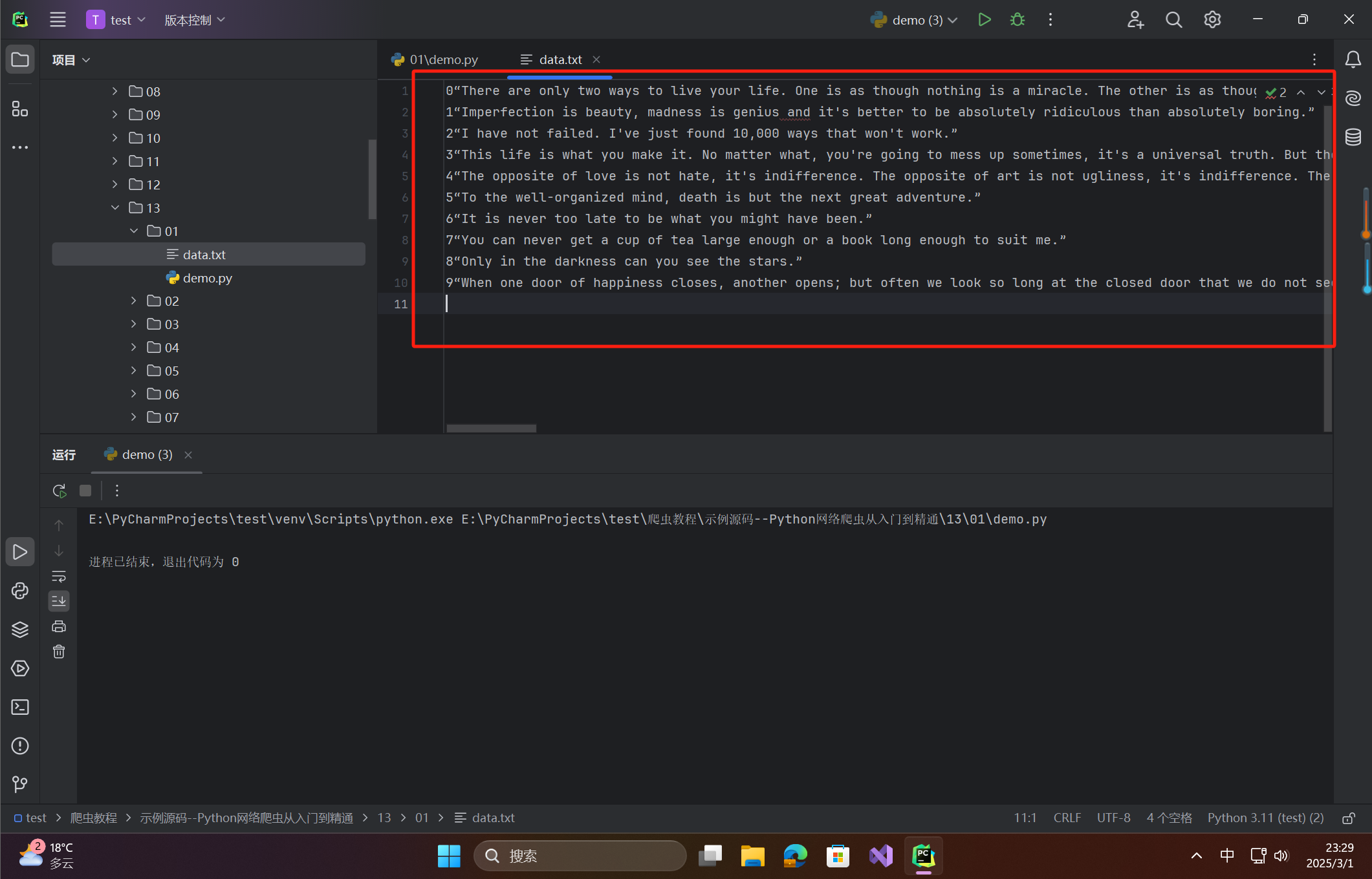 txt_file.write(str(i)+value.text+'\n') # 写入每条爬取的励志名句并在结尾换行