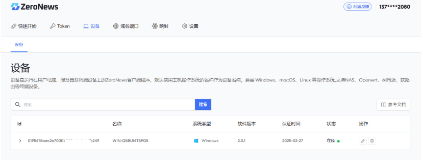 ZeroNews 启动后,您可以在 ZeroNews 平台上查看设备状态,确认其已成功上线。