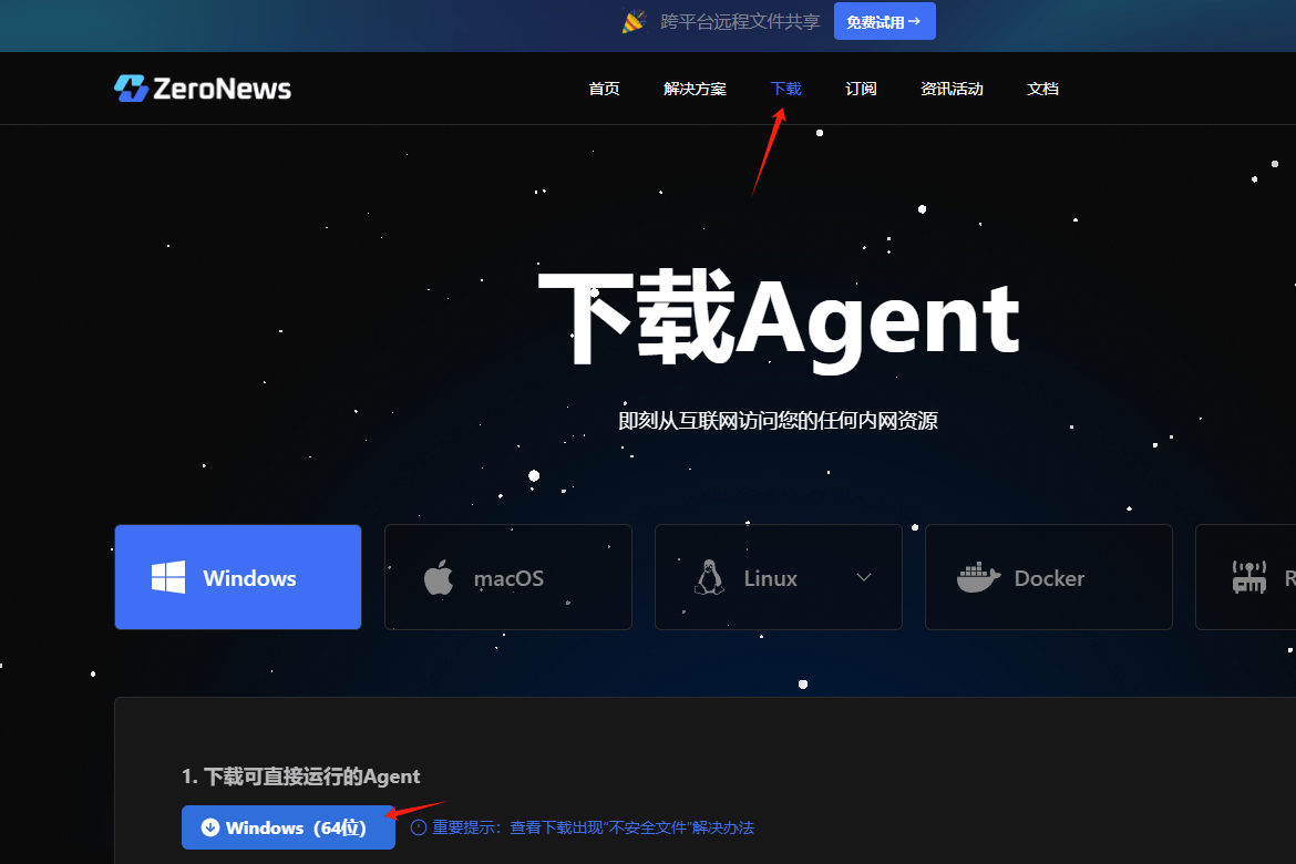然后,访问 ZeroNews 官网的Agent页面,将 ZeroNews Agent zeronews.exe 下载到指定的目录。