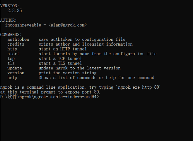 执行成功后,命令行界面中会出现下面的信息。此时,代表配置成功。ngrok程序已经在你的用户目录下,创建一个.ngrok2文件夹,并在文件夹中创建一个配置文件ngrok.yml。