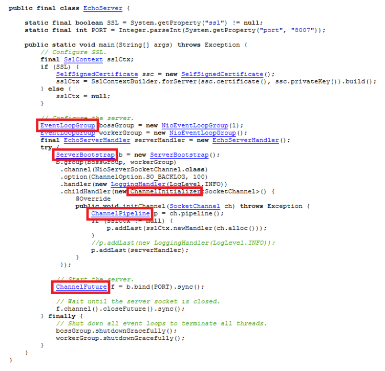 同样是以简化的Echo Server为例,下图是Netty官方提供的Server部分。