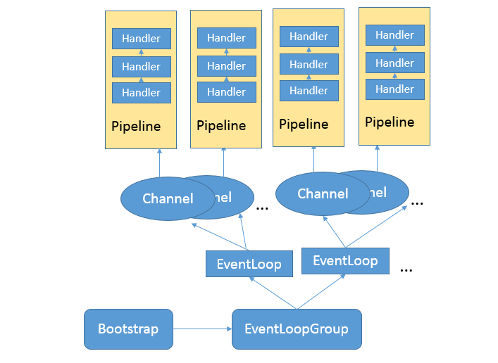 你可以参考下面的简化示意图,忽略Inbound/OutBound Handler的细节,理解这几个基本单元之间的操作流程和对应关系。