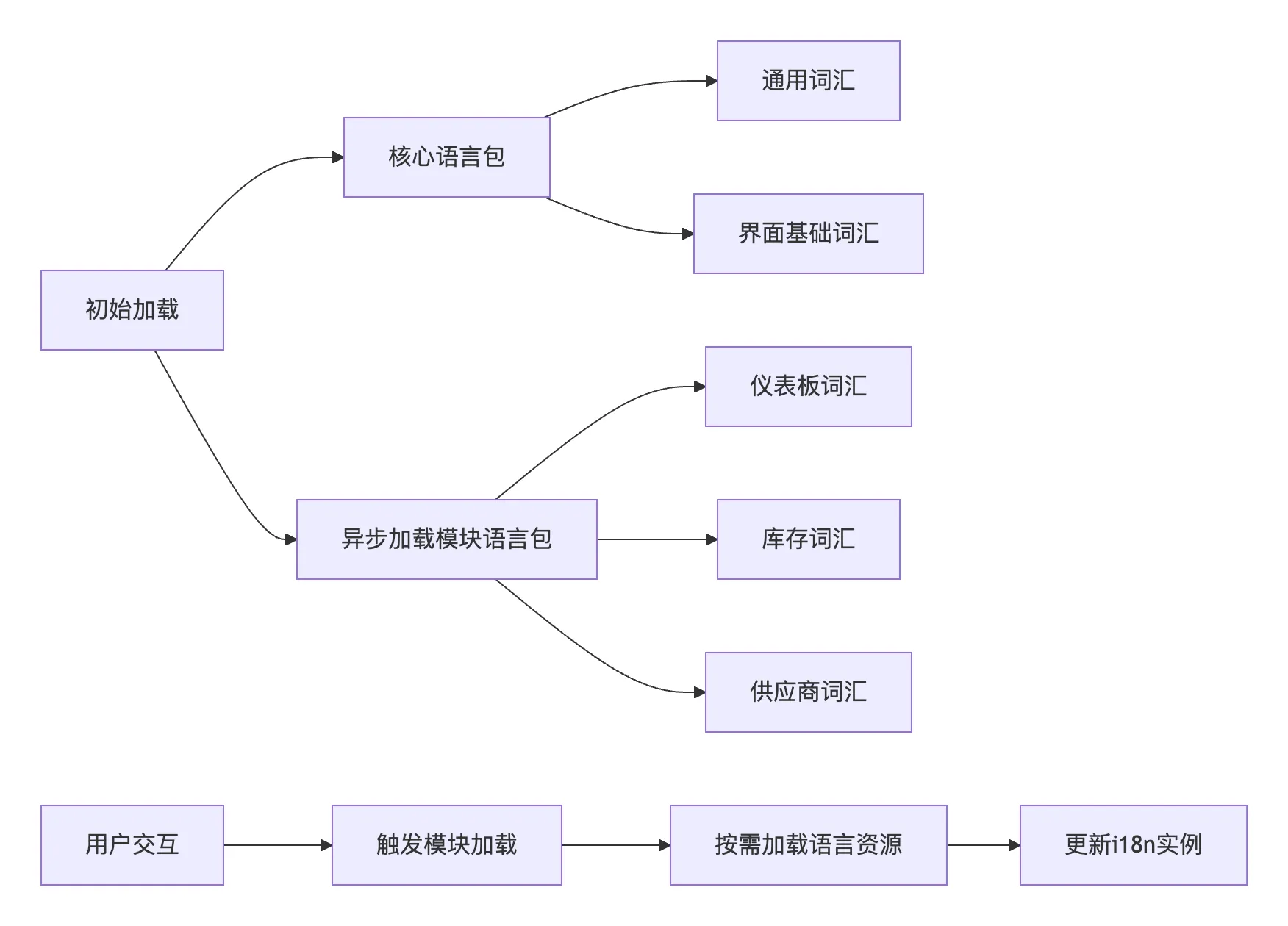 采用模块化语言资源组织方式,按功能模块划分命名空间,减少初始加载体积。