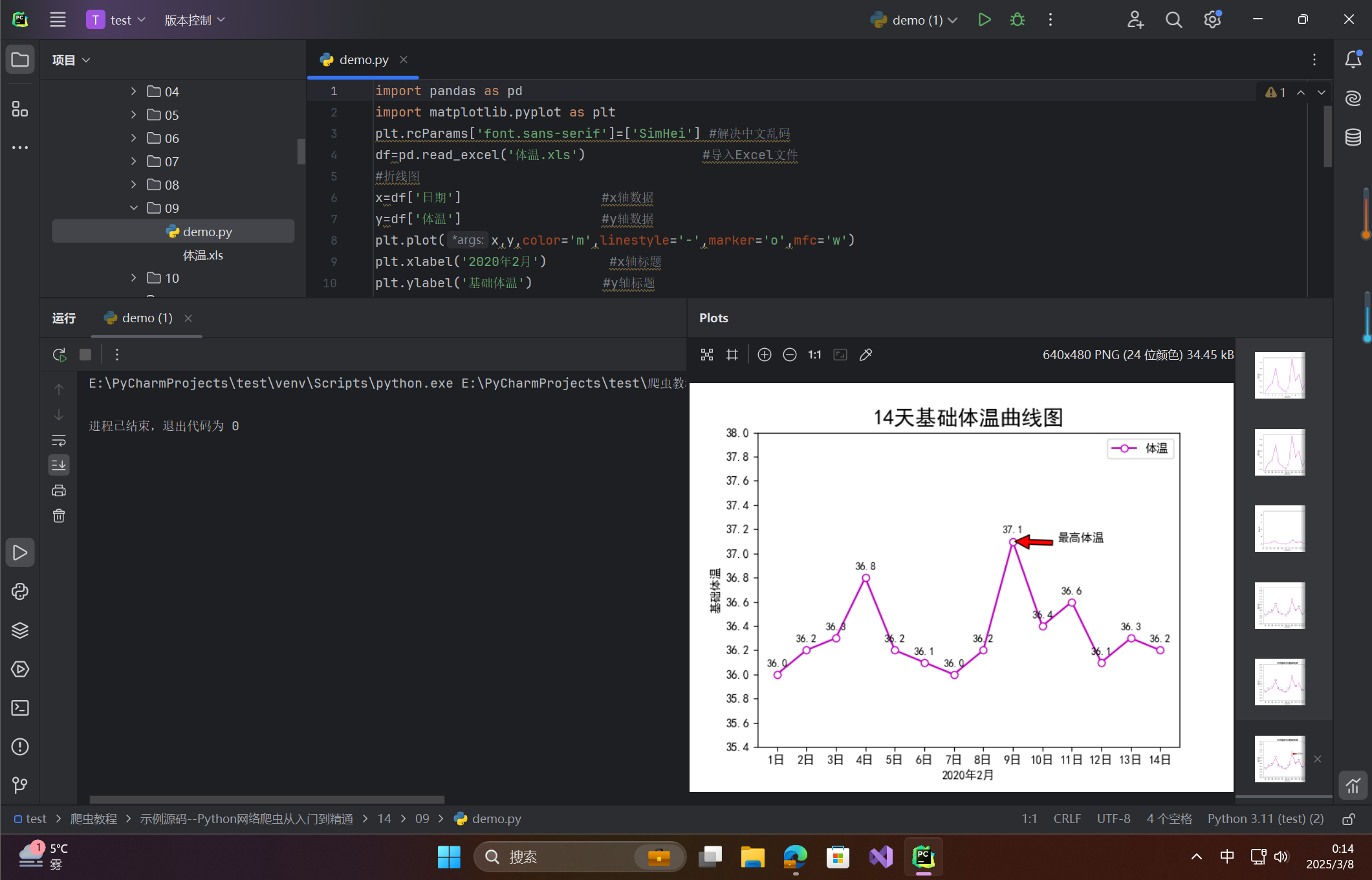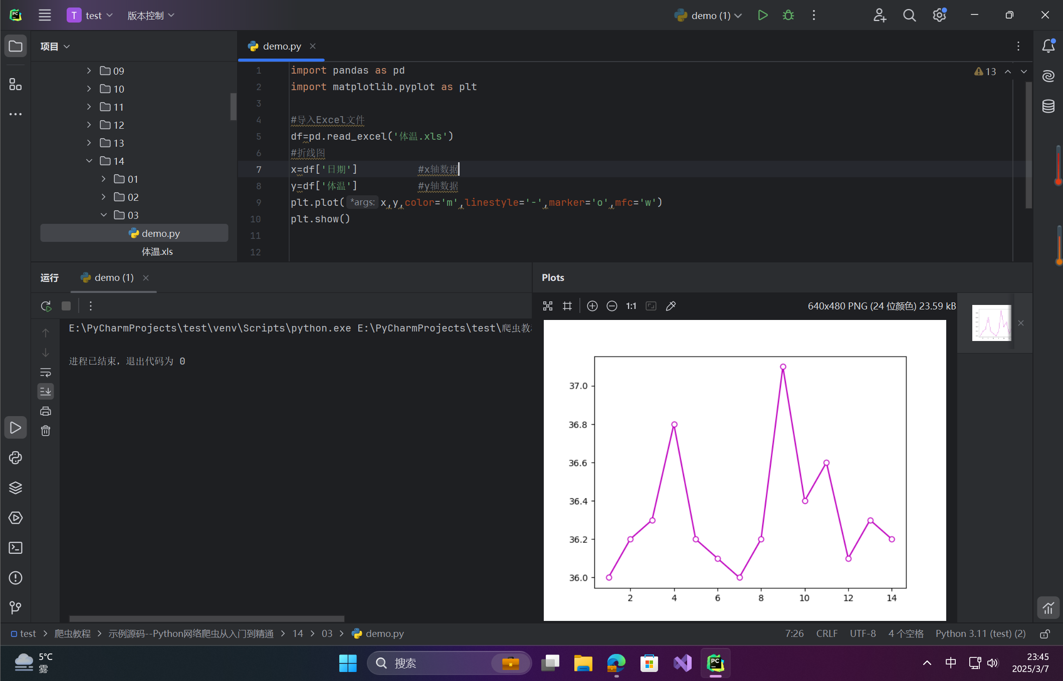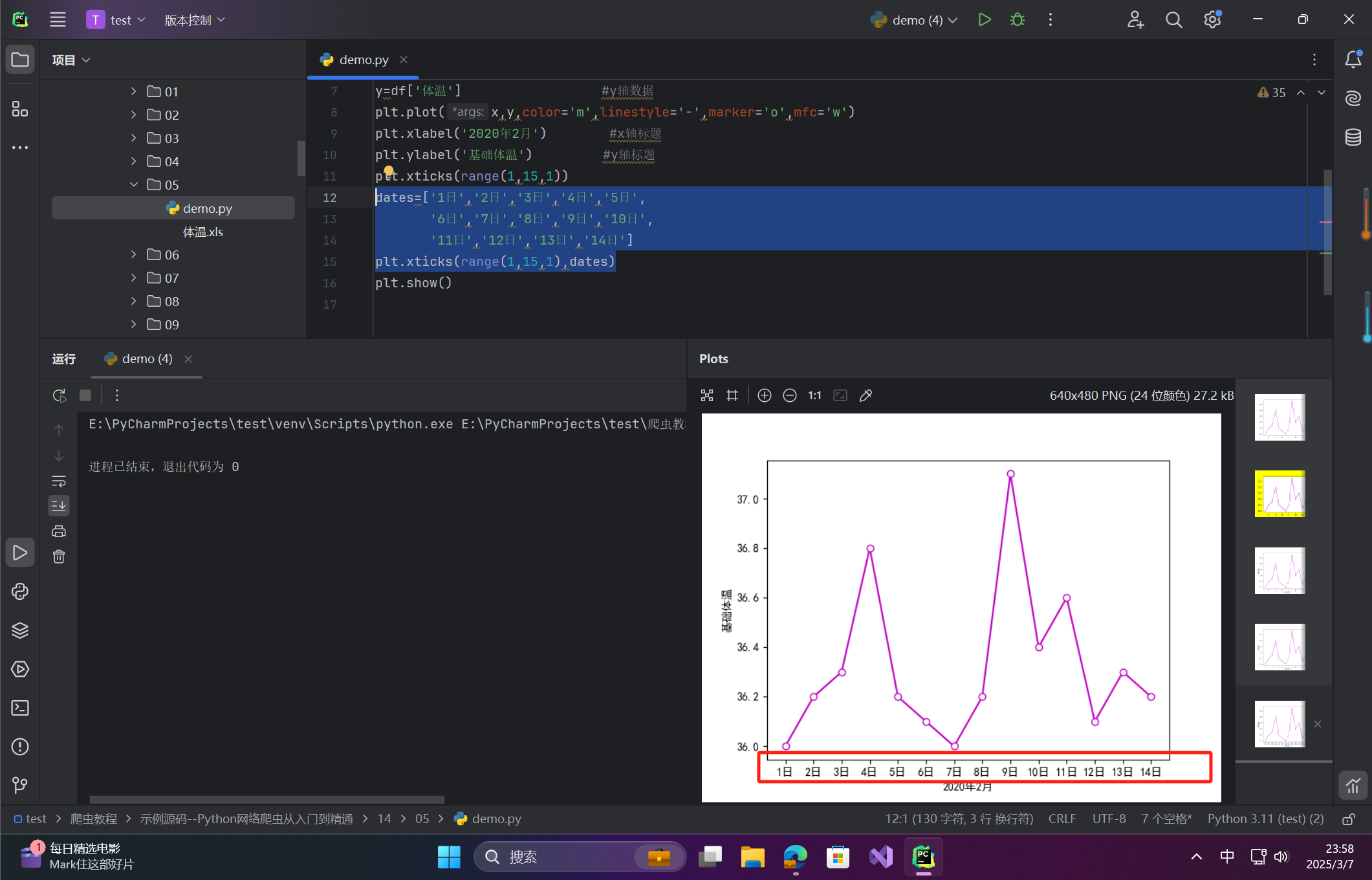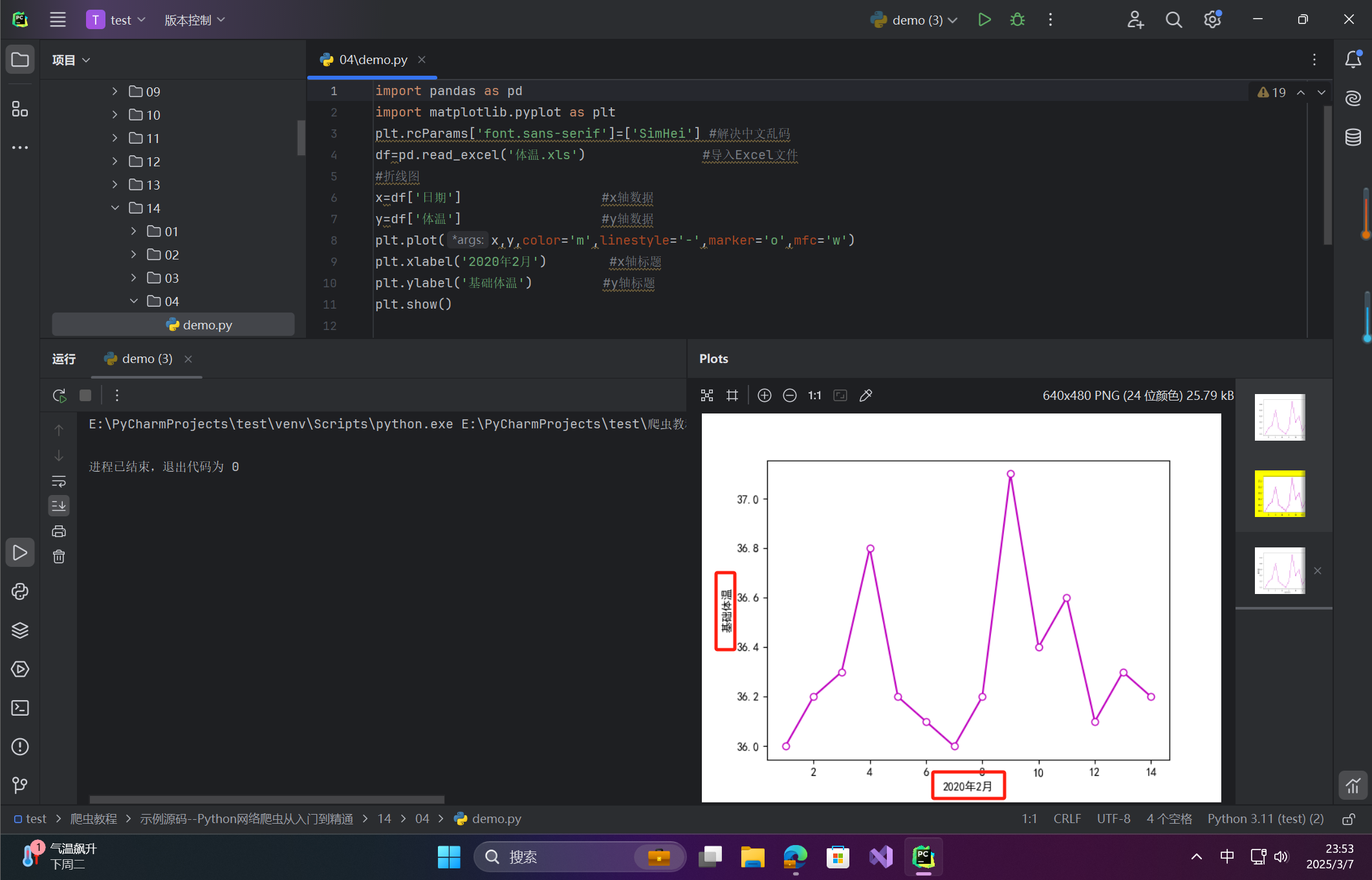 y=df['体温'] #y轴数据