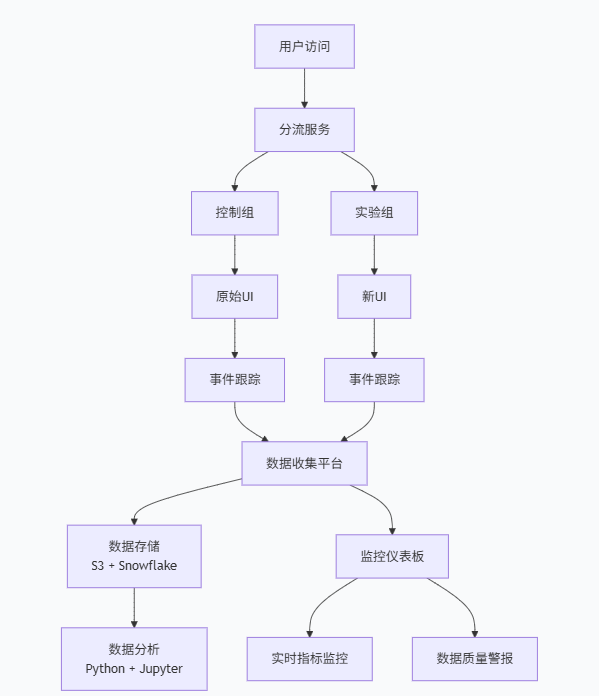在实际运行A/B测试前,需要建立可靠的技术基础设施来实现用户分流、变量控制和数据收集。本节将详细介绍技术实现方案和数据收集策略。