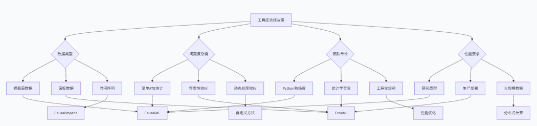 当前因果推断工具库生态呈现多元化发展,不同库有各自的设计哲学和优势: