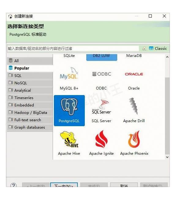 第2步:选择你需要连接的数据库类型,这里以PostgreSQL为例,点击图标后再点"下一步(N)"