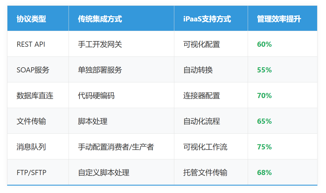 与传统点对点集成方式相比,iPaaS在多个维度上具有明显优势: