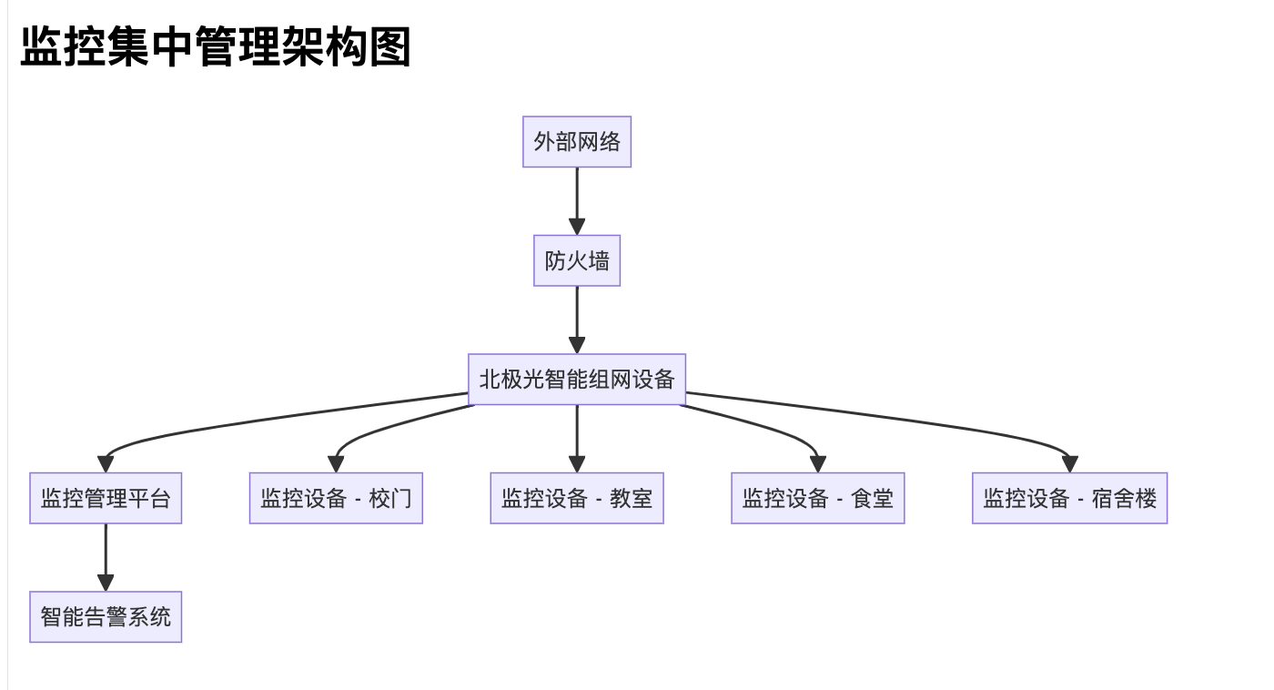在优化网络架构和监控管理的过程中,北极光智能组网技术发挥了重要作用。其支持多场景组网模式,提供了低延迟、高带宽和灵活扩展的解决方案,使得监控视频传输更加稳定、管理更加高效。同时,北极光的智能组网技术还兼顾了监控系统与巡检系统的联动需求,为校园安全提供了全面支撑。
