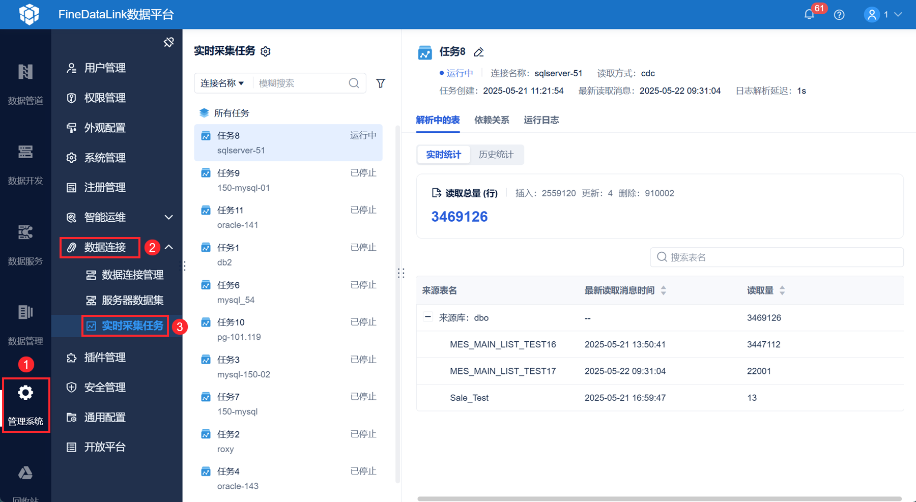 我们可以在FineDataLink这里可以点击管理系统,在数据连接的实时采集任务里进行数据的采集操作。