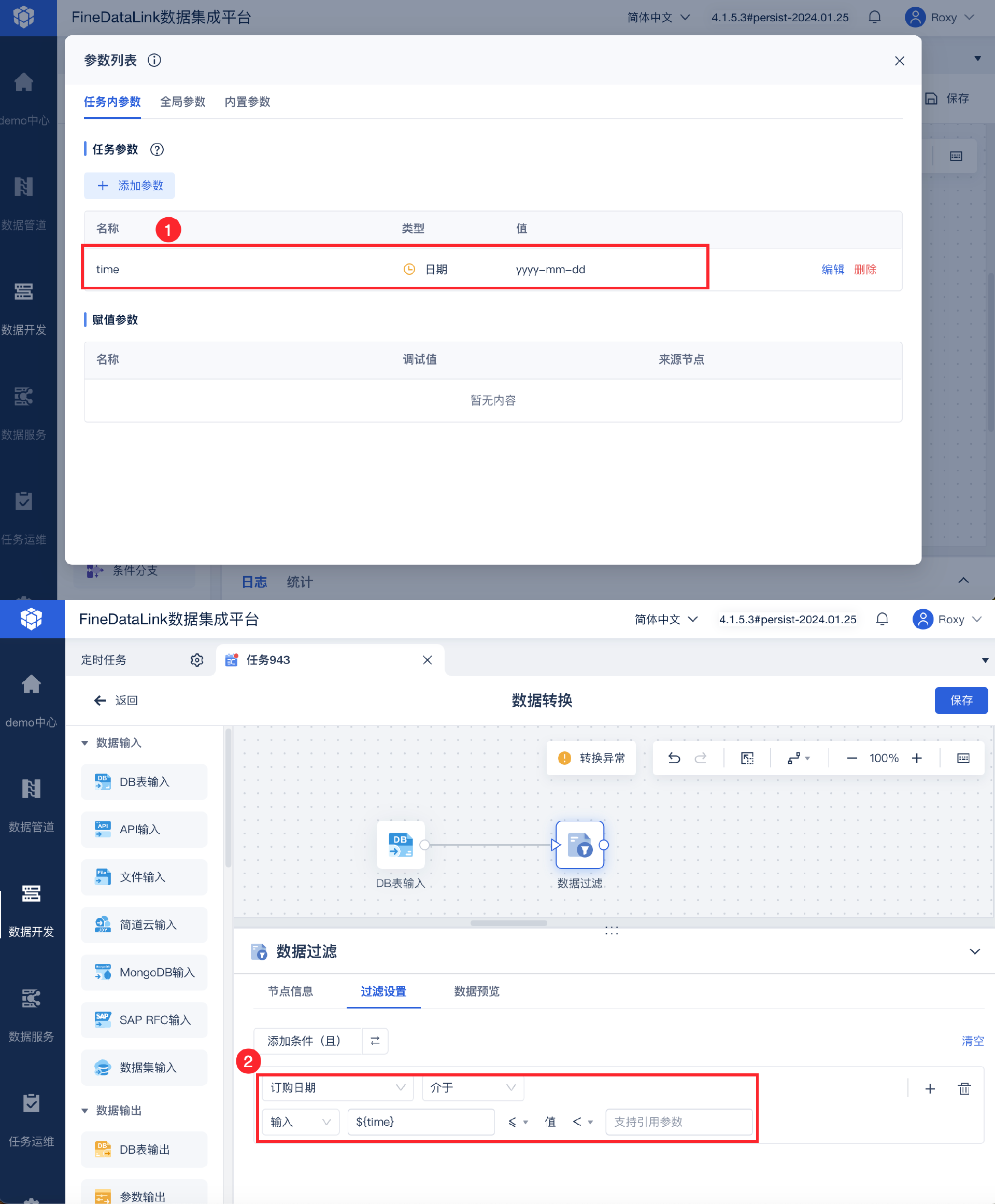 比如在这里我们可以用FineDataLink来设置参数和过滤条件,这样就能做到对数据进行过滤操作。