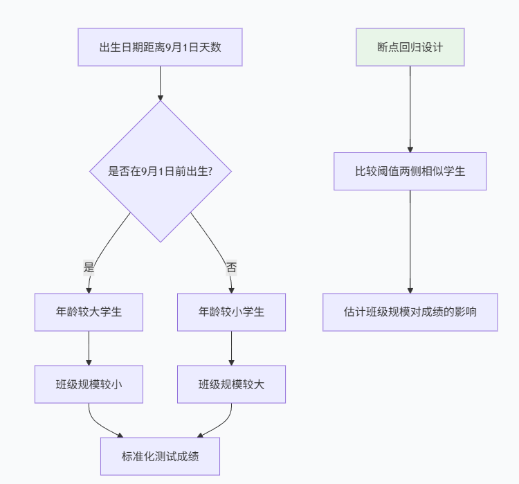 为了具体说明断点回归设计的应用,我们考虑一个教育经济学中的经典问题:班级规模对学生学业成绩的影响。这个问题具有重要的政策意义,但面临严重的内生性挑战——班级规模往往与学校特征、学生构成等混杂因素相关。