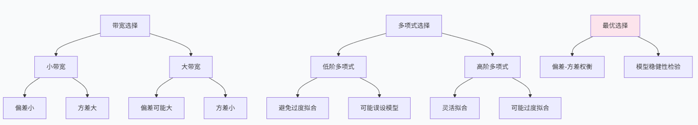 这种解释强调了带宽选择的重要性。带宽越窄,局部随机化的近似越好,但可用的观测值越少,估计精度越低。因此,RDD分析需要在偏差和方差之间进行权衡。