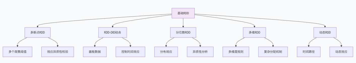 多断点设计 | 多个政策阈值 | 提高统计功效,检验效应异质性 | 需要足够样本,效应可比性 |