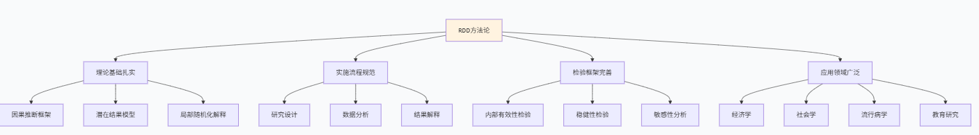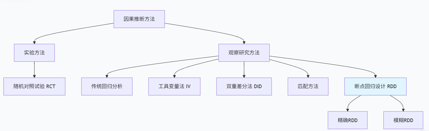 断点回归设计 | 利用阈值附近的不连续性 | 连续性假设 | 有明确分配规则 | 内部有效性接近RCT |