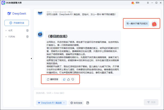 完成模型下载,在主界面点击【立即体验】进入智能对话界面。主界面就像个聊天窗口,直接输入问题就行,比如“写一篇关于春天的短文”,模型会快速给出回复。