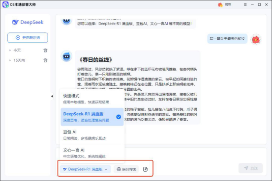 要是想换版本,点击左下角“模型切换”,选好模型后即可直接用,软件支持DeepSeek满血版、豆包、文心一言等,大家可随意使用。