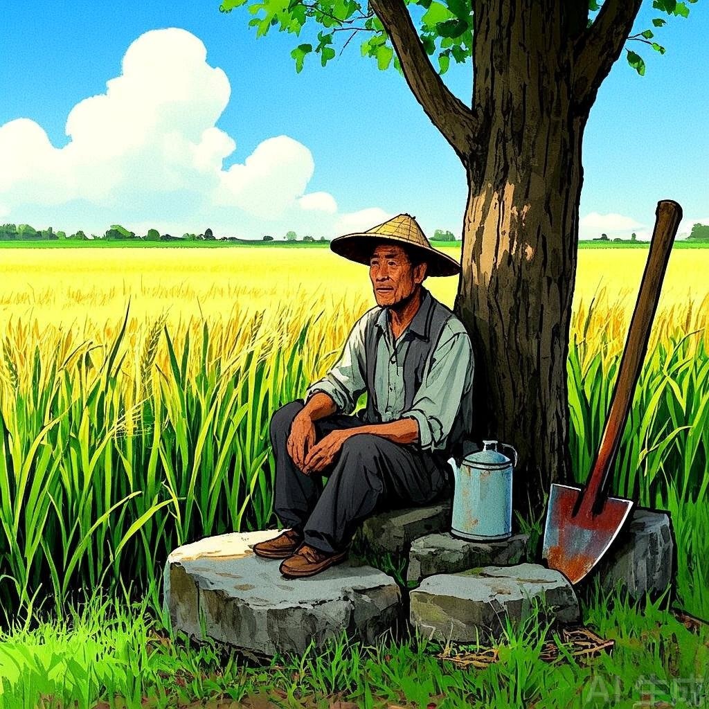场景4 | 放弃耕作的等待(行为荒诞) | 空荡的农田、树桩旁的农夫、破旧的斗笠/水壶 | 原本绿油油的农田里,杂草开始冒头(麦苗枯黄蜷缩),农具(锄头)斜靠在田埂边生锈了。农夫不再劳作,而是盘腿坐在那棵“幸运树桩”旁的石头上,戴着破旧的斗笠,身边放着空水壶,眼睛死死盯着树桩,嘴角还挂着若有若无的期待微笑。远处天空飘着几朵懒散的云。 | 对比之前辛勤劳作的场景,阳光强烈却照不进他呆滞的眼神,突出“不劳而获”的荒谬。 |