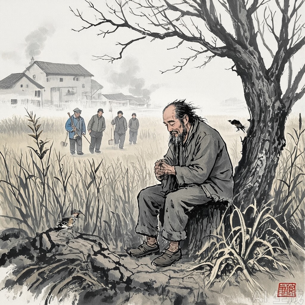 场景5 | 一无所获的结局(寓意升华) | 枯萎的农田、嘲笑的村民、依旧等待的农夫 | 深秋的田野里,庄稼全部枯死(土地干裂,杂草丛生),农夫依旧坐在那棵光秃秃的老树桩旁(衣服破旧,头发蓬乱),眼神空洞地望着前方,手里无意识地抠着树皮。不远处,几个扛着农具的村民路过,指着农夫摇头议论(有人捂嘴笑,有人摊手叹气),背景的村庄屋顶冒着炊烟。画面角落可添加一只麻雀落在树桩上。 | 整体色调偏灰暗,象征时间的流逝,揭示“守株待兔”终将一无所获的深刻道理。 |