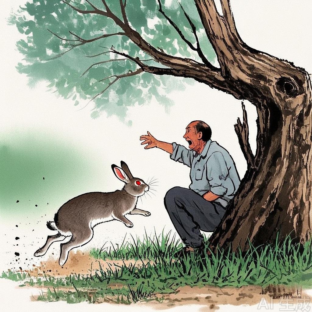 场景2 | 兔子撞树的瞬间(关键转折) | 惊慌的野兔、粗壮的树桩、飞溅的泥土/草屑 | 农夫正蹲在田边休息,突然,一只灰棕色的野兔从右侧的灌木丛中窜出,红眼睛瞪得圆圆的,耳朵因惊吓竖起,前腿僵直后腿猛蹬,整个身体呈“飞扑”状撞向画面左侧一棵断裂的老树桩。兔子的身体几乎与地面平行,扬起的尘土和小草碎屑在它身后形成动态模糊,农夫惊讶地张大嘴巴转头看向树桩。 | 定格“意外发生”的戏剧性时刻,充满动感。 |