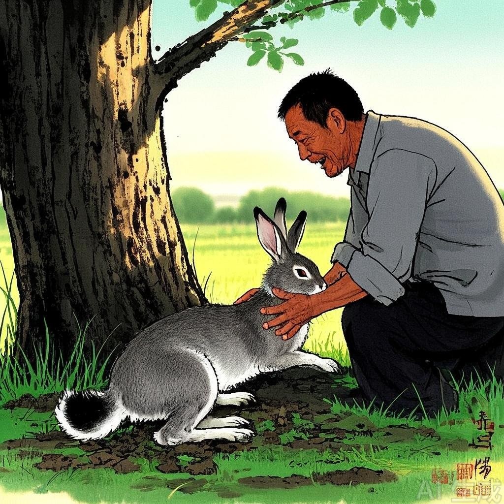 场景3 | 农夫捡到兔子的惊喜(动机强化) | 倒地的死兔、农夫弯腰拾取、树桩特写 | 撞晕的野兔躺在树桩旁的草地上,后腿微微抽搐(或已完全不动),灰毛上沾着泥土和草叶。农夫三步并作两步跑过去,双手小心翼翼地捧起兔子(露出惊喜的表情,眼角带笑,嘴角上扬),背景的树桩被阳光照亮。远处的农田被虚化成模糊的绿色色块。 | 强调此刻农夫眼中只有这只“从天而降”的兔子,突出“幸运物”的存在感。 |