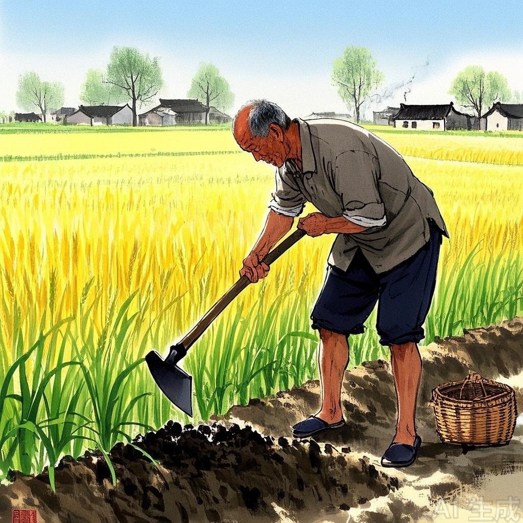 场景1 | 农夫的日常劳作(故事开端) | 农夫、农田、锄头、烈日/清晨光线 | 春日的田野里,金黄的麦苗刚抽出新芽,一位穿着粗布短衫的中年农夫弯腰握着锄头,在田垄间认真翻土。阳光斜照在他微汗的额头上,远处是几棵稀疏的杨树,近处田埂上放着他的斗笠和竹篮。背景虚化的村庄屋顶飘着炊烟。 | 水墨风,体现“靠双手吃饭”的平凡生活,氛围宁静而勤劳。 |