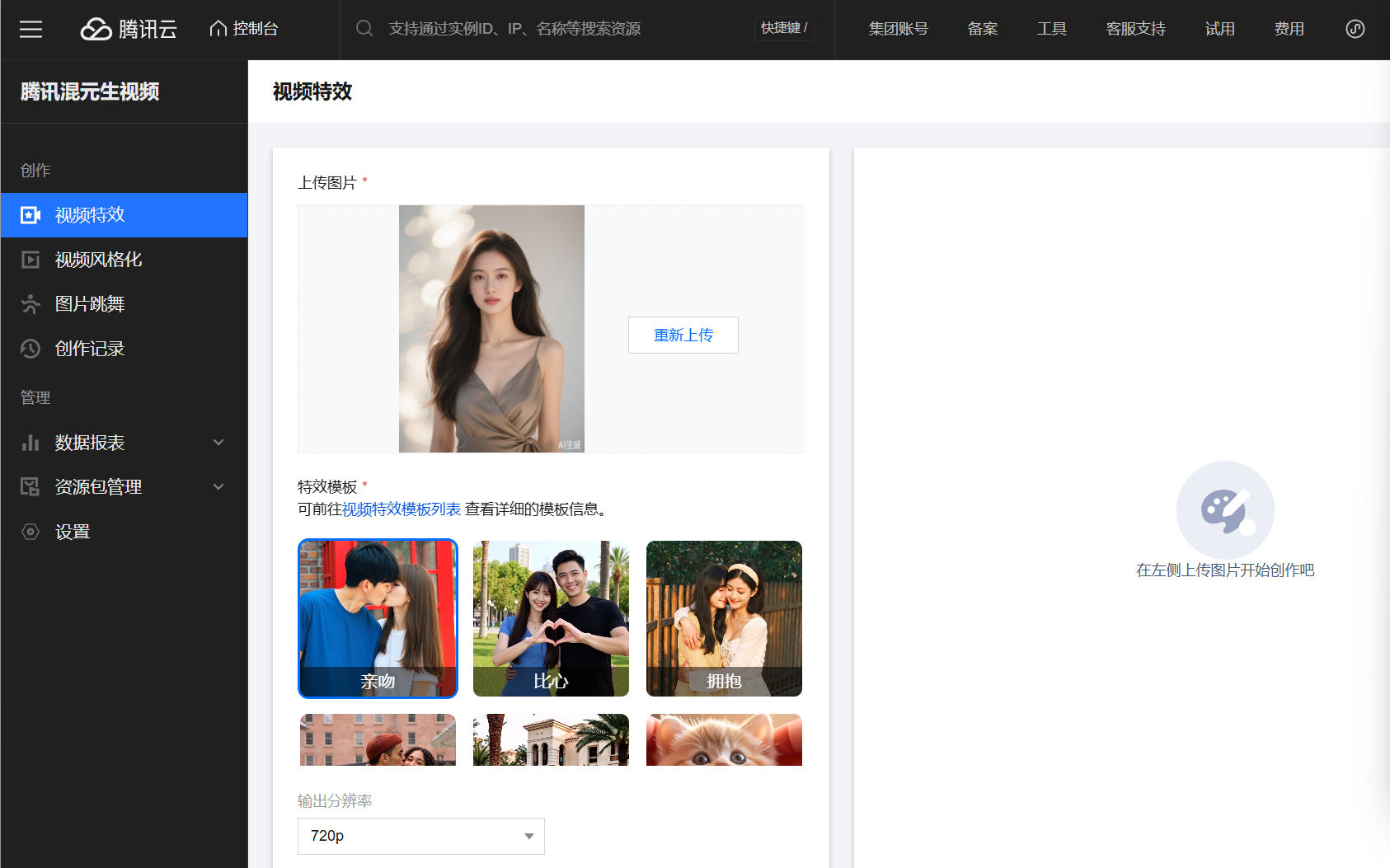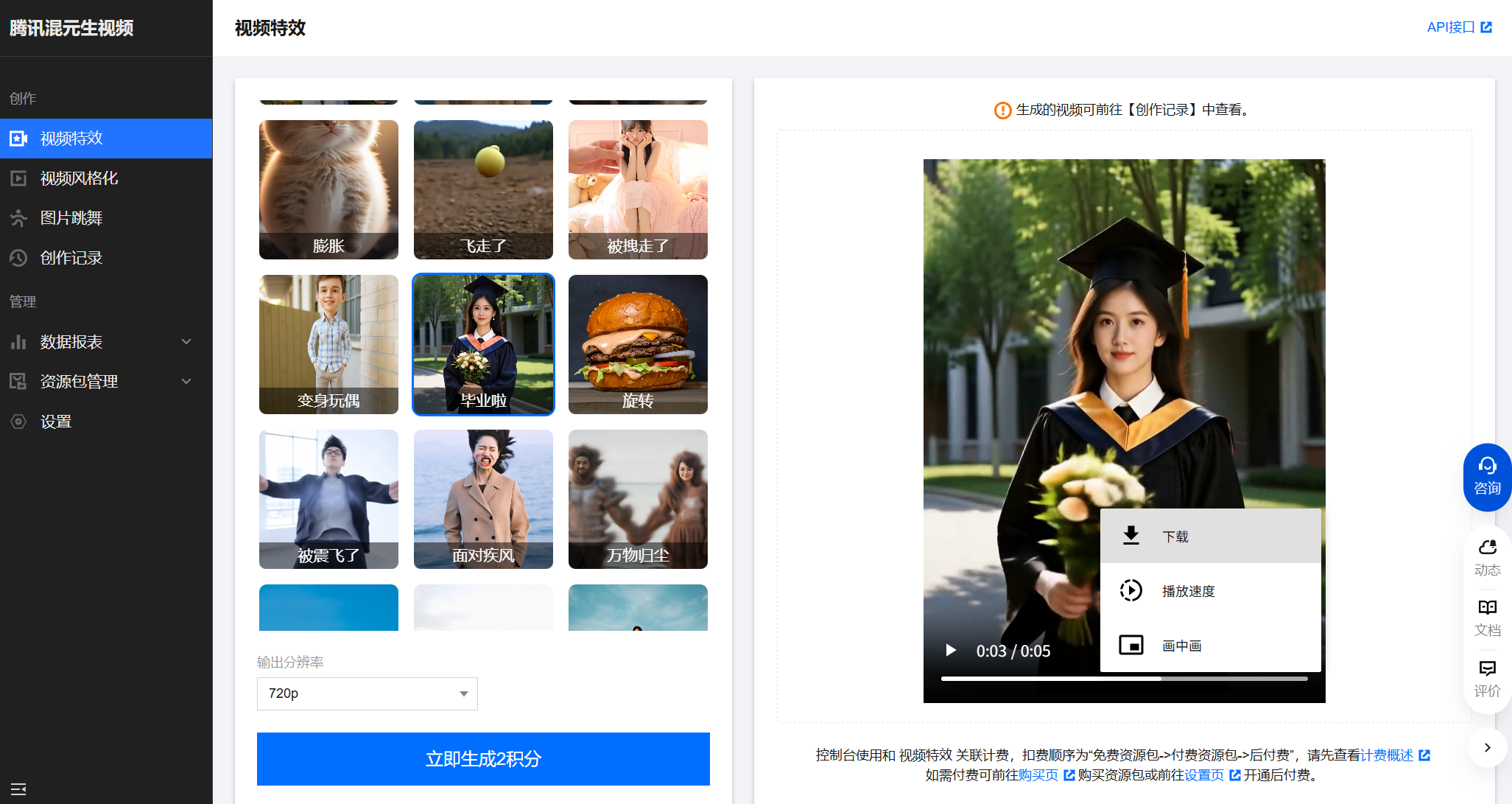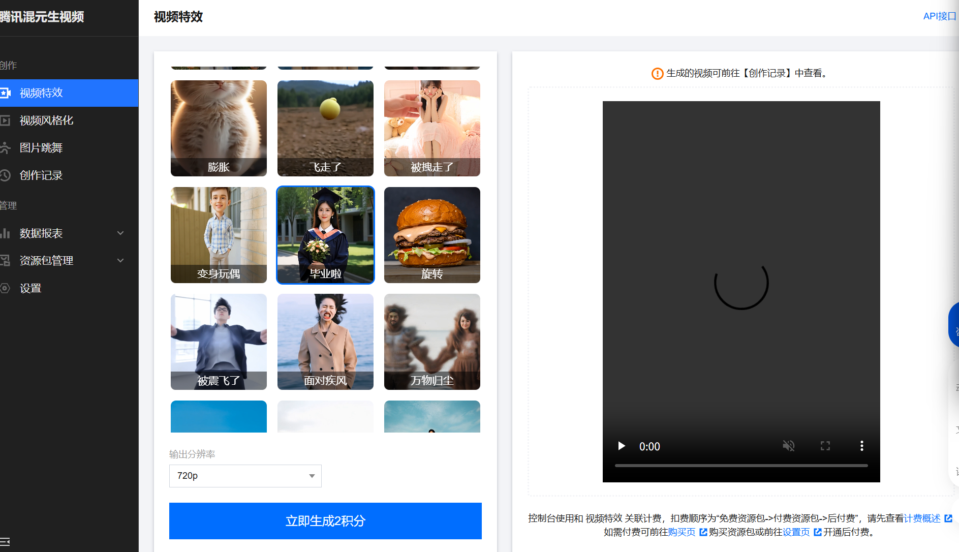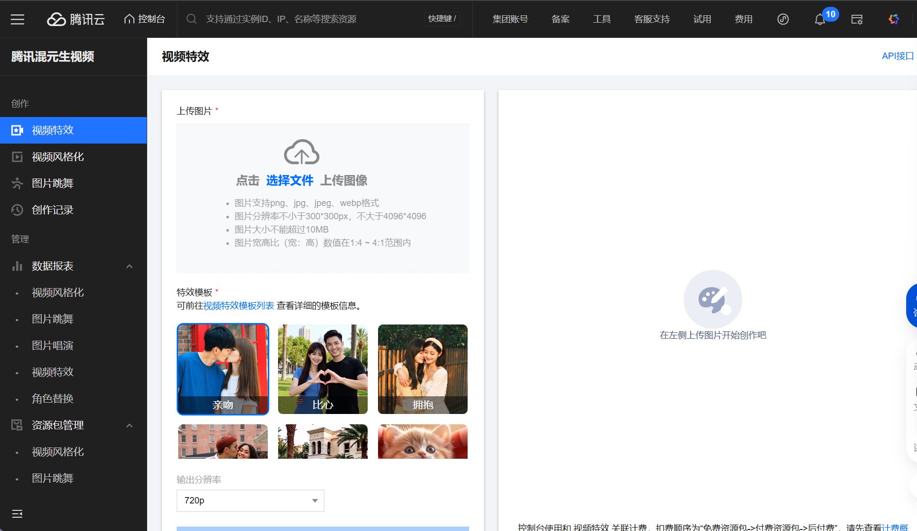 进入腾讯混元生视频控制台页面,可以看到腾讯混元生视频主要有3个方面的功能:视频特效、视频风格化、图片跳舞。