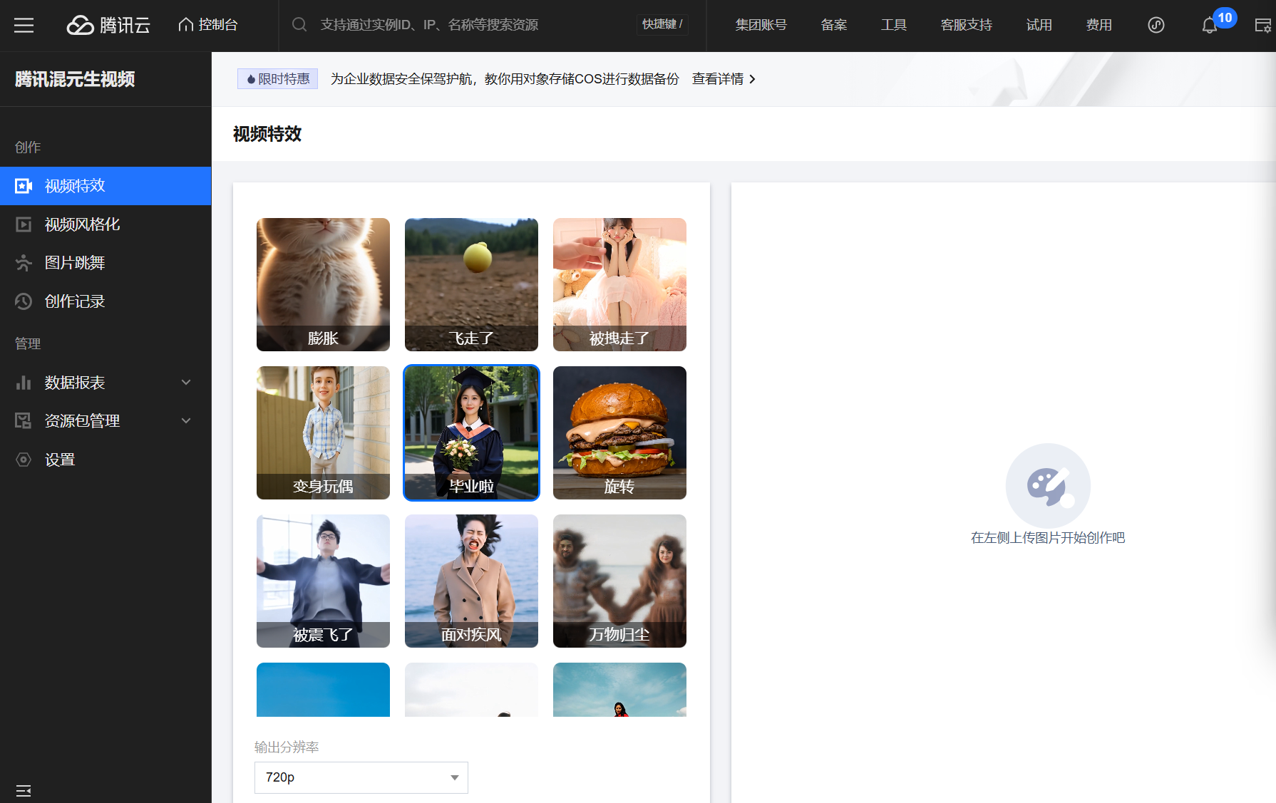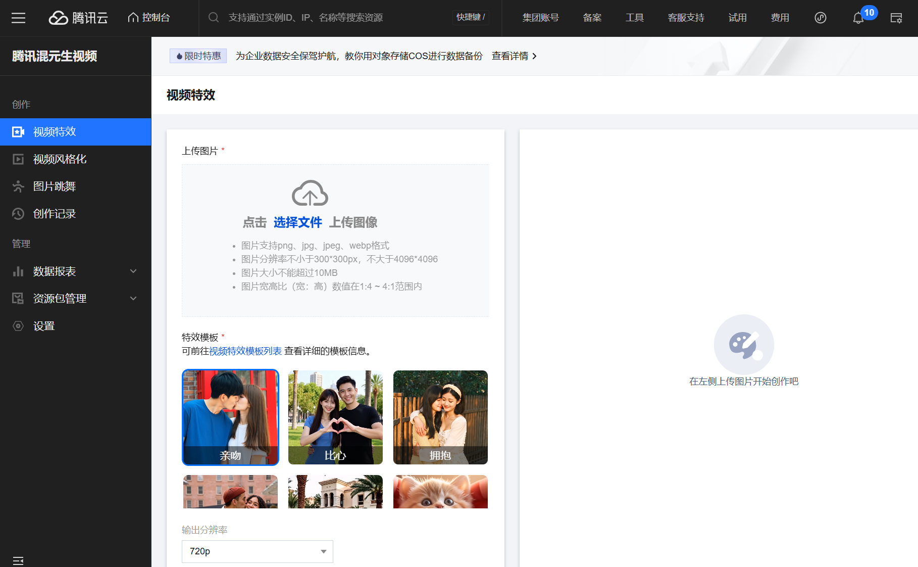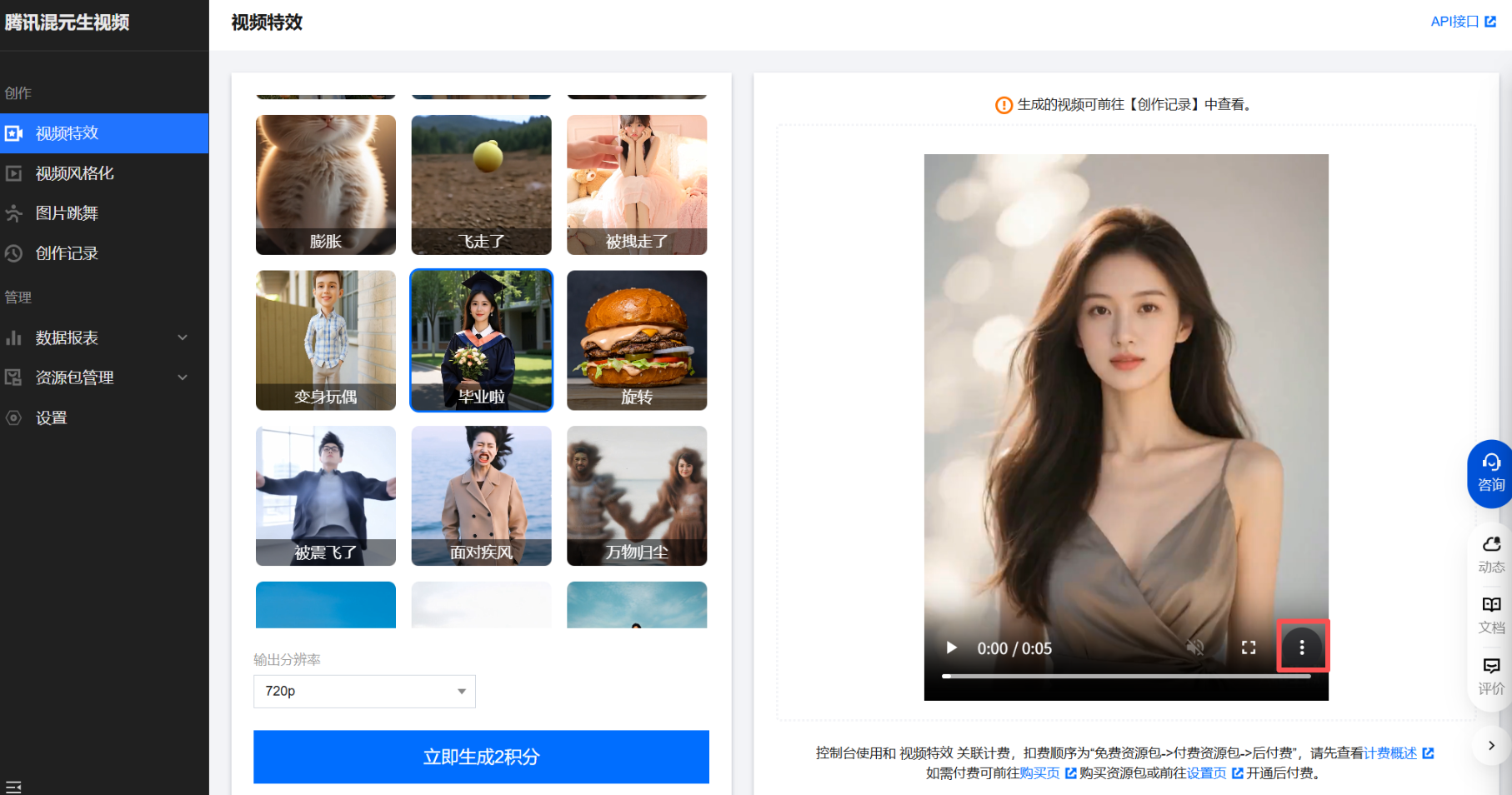 进入腾讯混元生视频控制台页面,可以看到腾讯混元生视频主要有3个方面的功能:视频特效、视频风格化、图片跳舞。