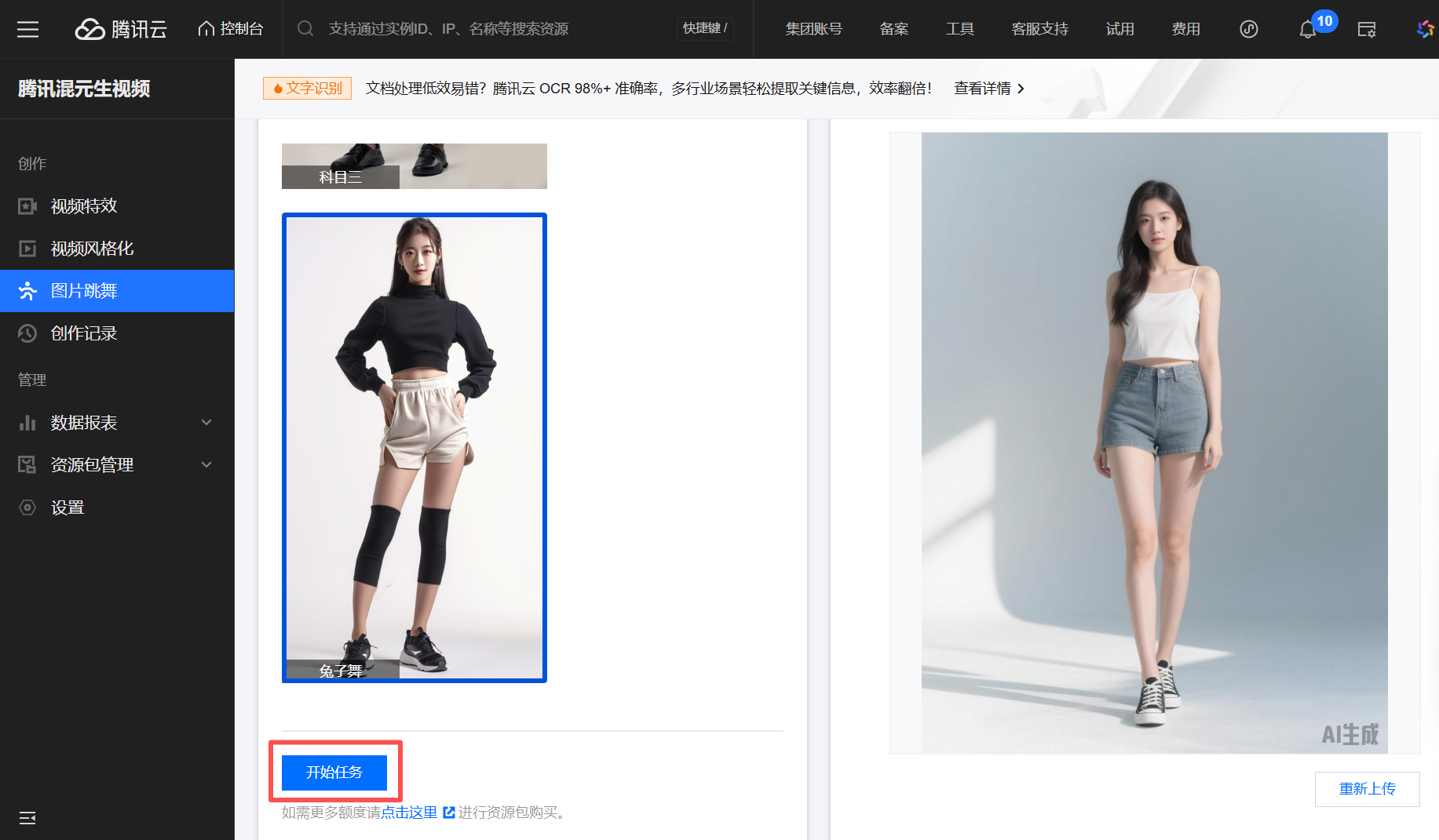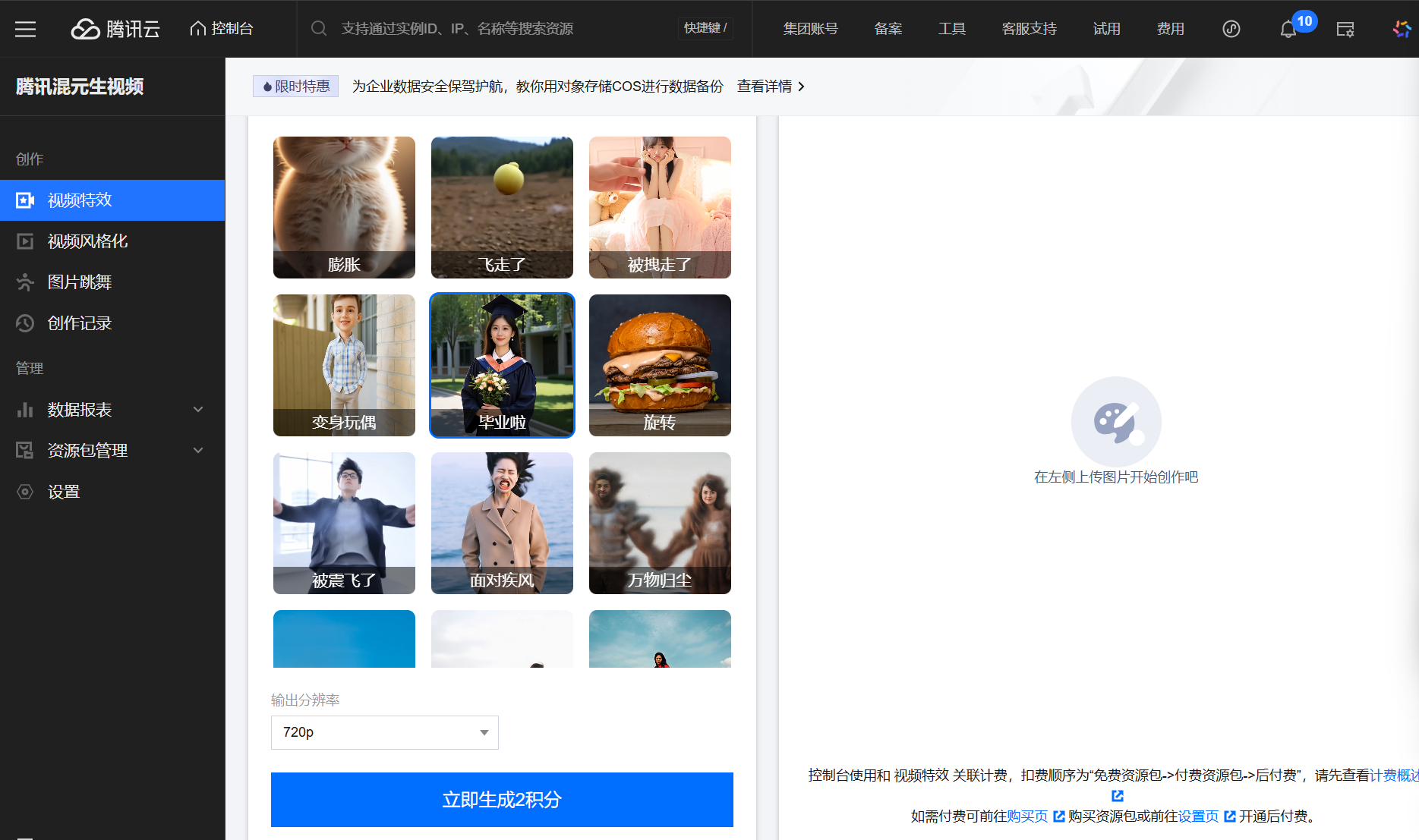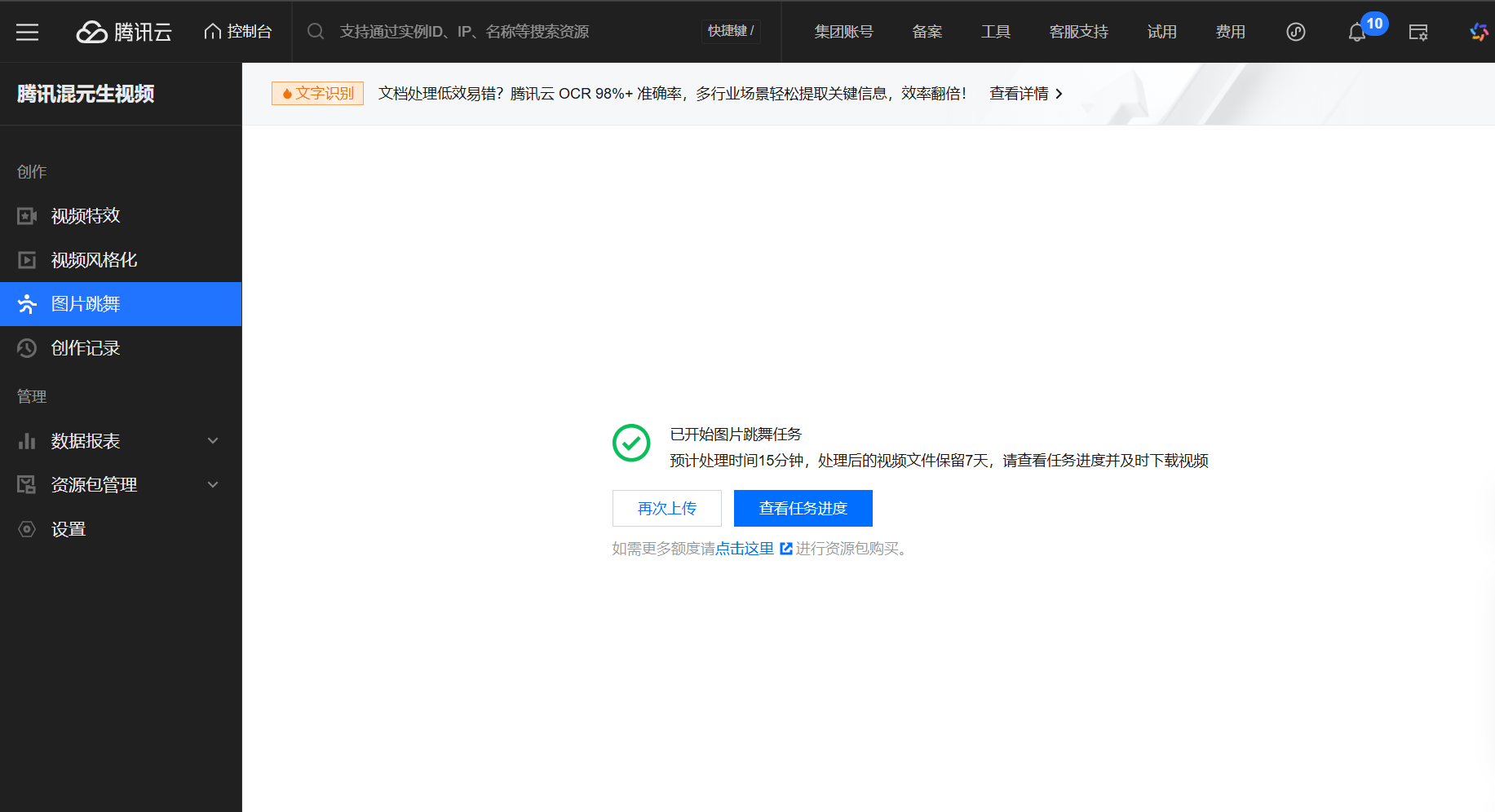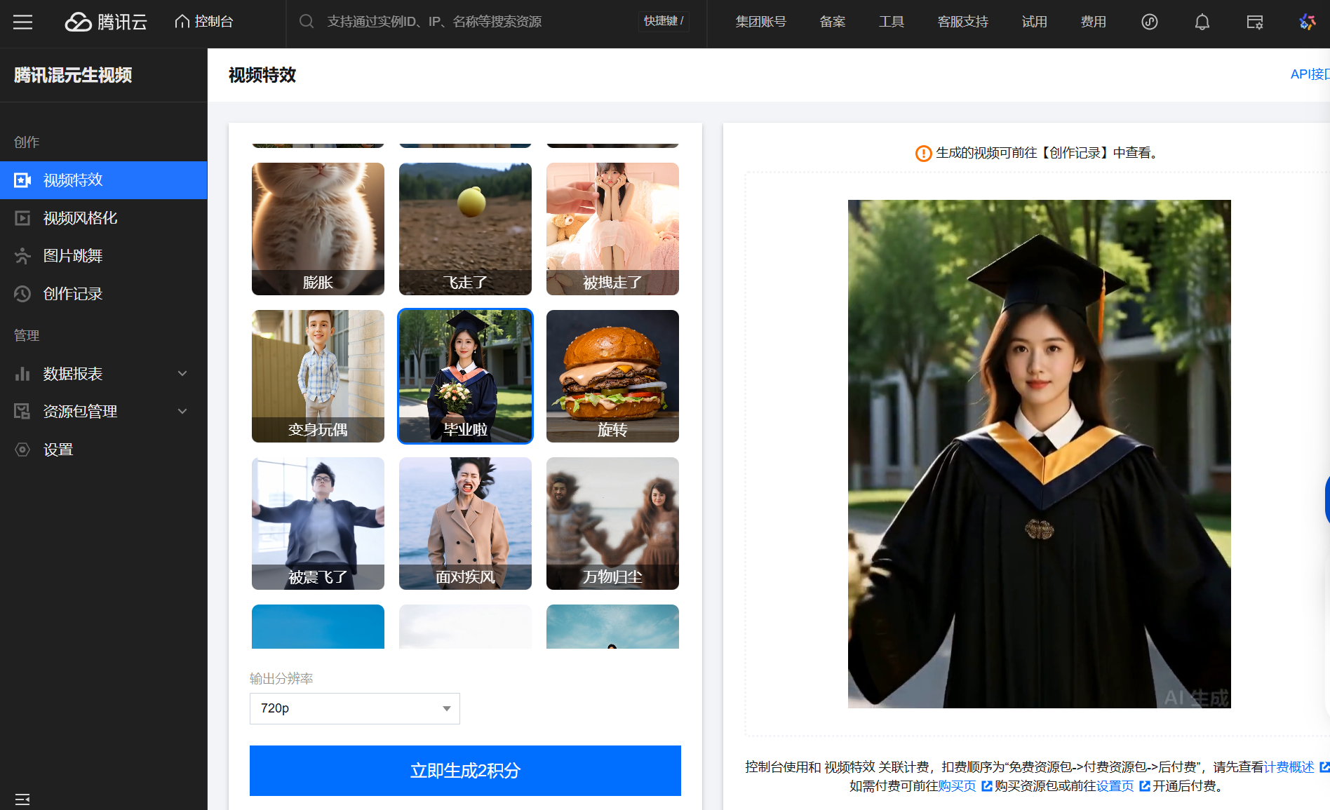 进入腾讯混元生视频控制台页面,可以看到腾讯混元生视频主要有3个方面的功能:视频特效、视频风格化、图片跳舞。