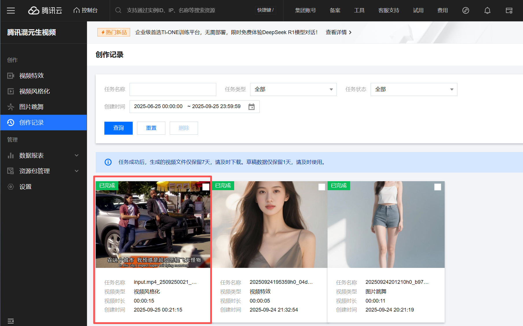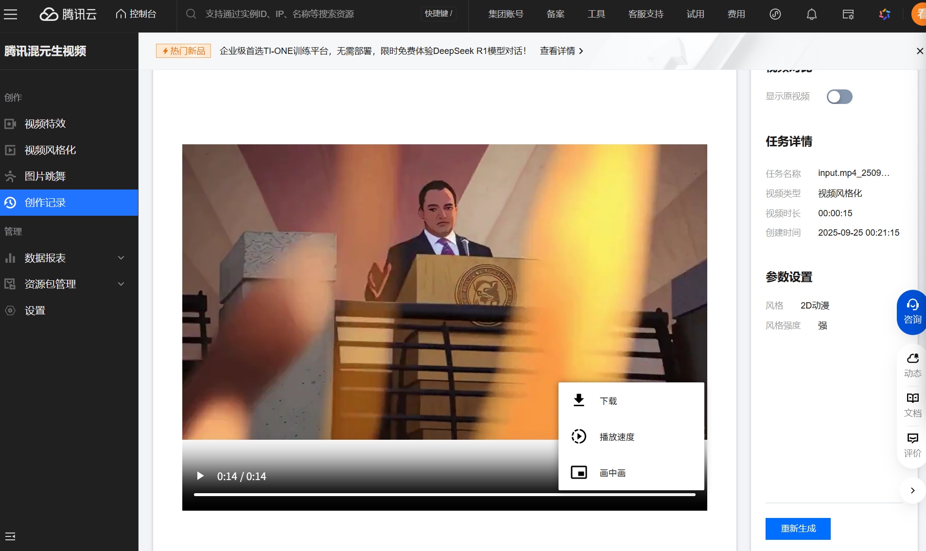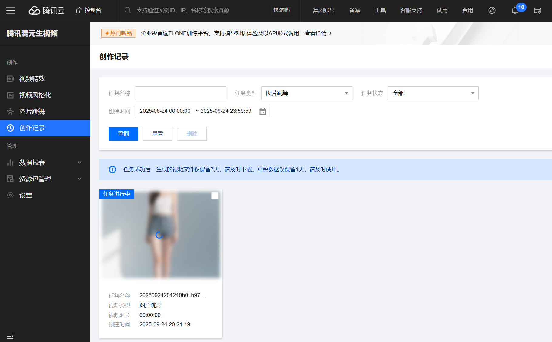 等待15分钟后,在创作记录页面,可以看到已经生成的视频