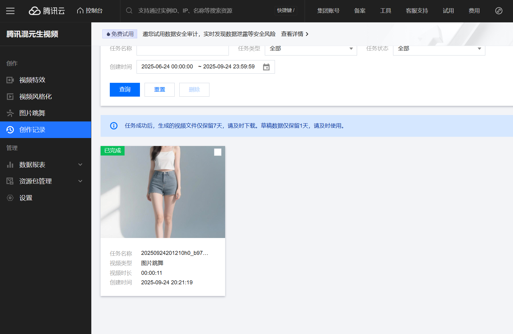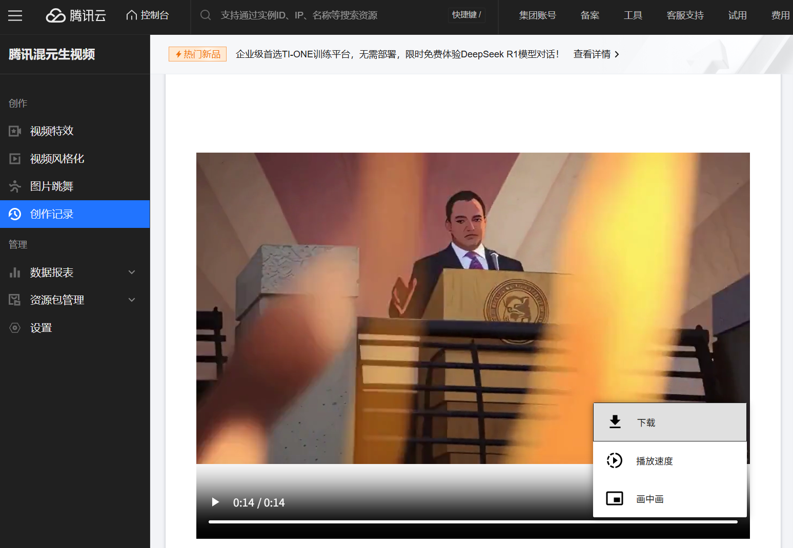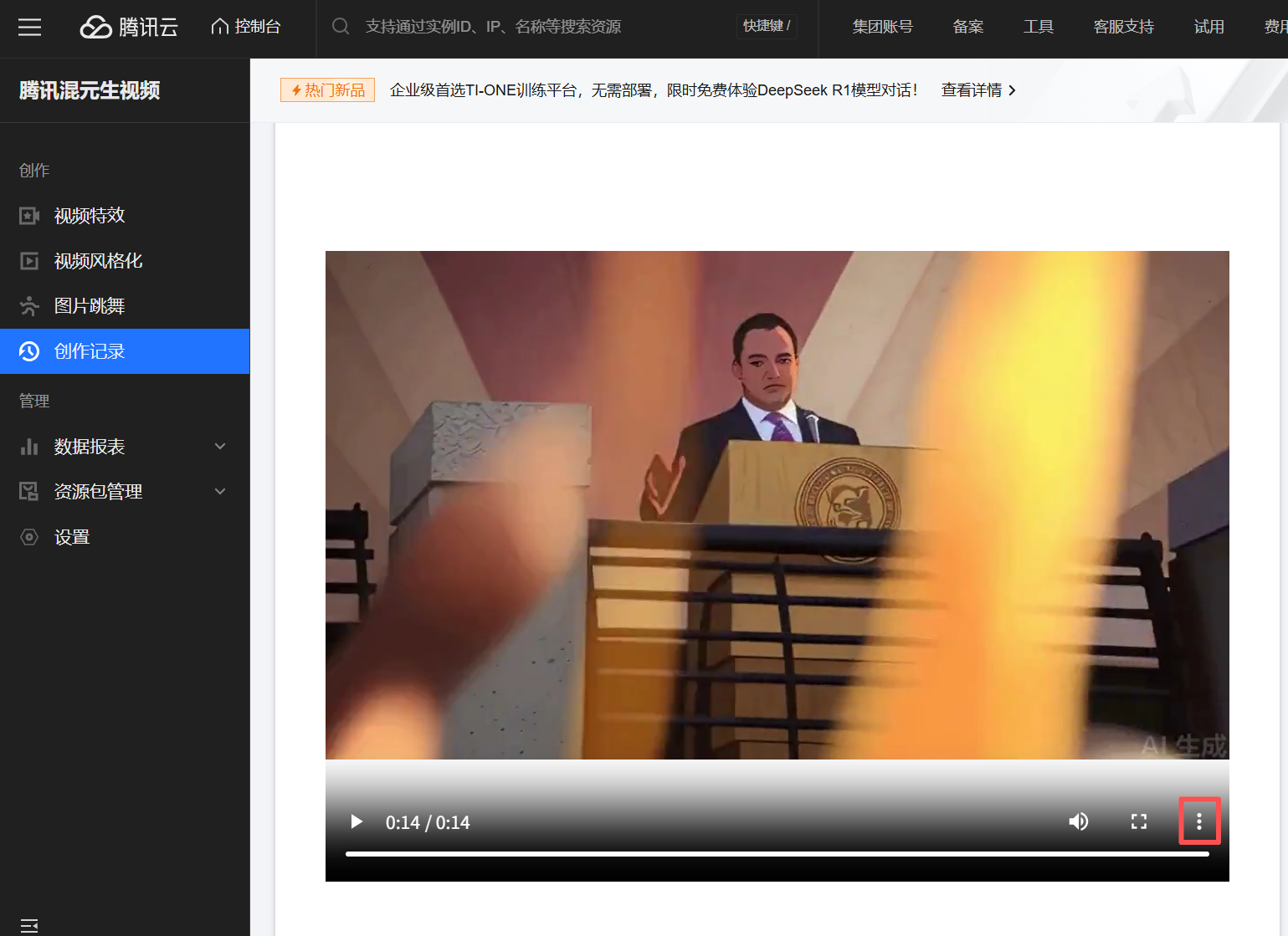 等待15分钟后,在创作记录页面,可以看到已经生成的视频