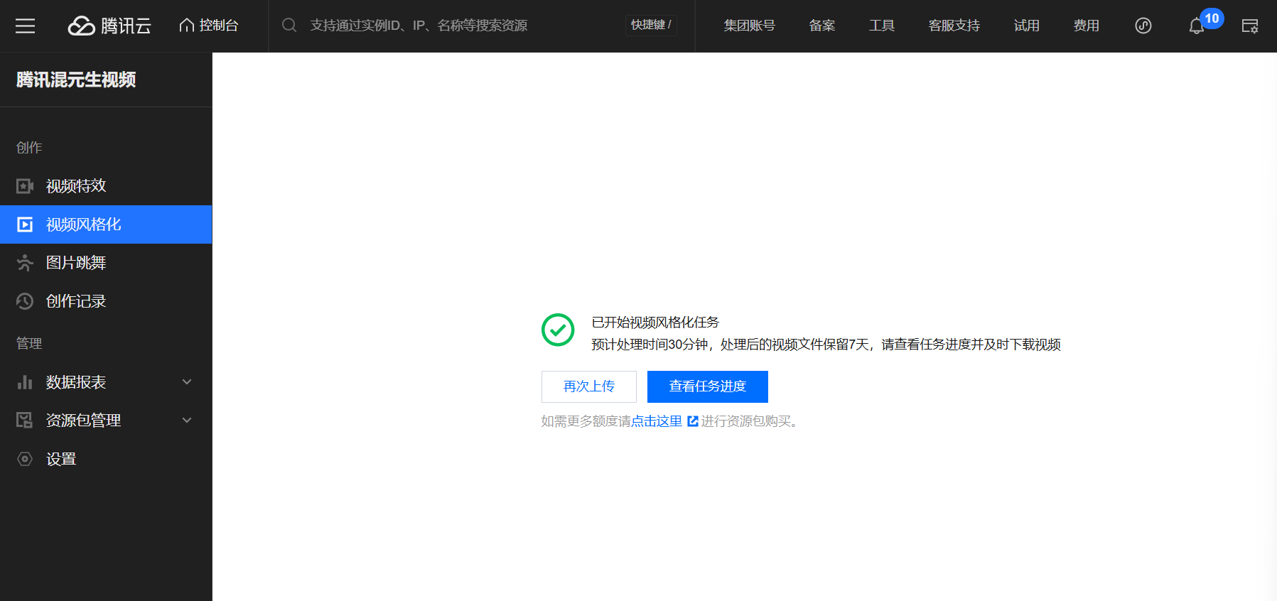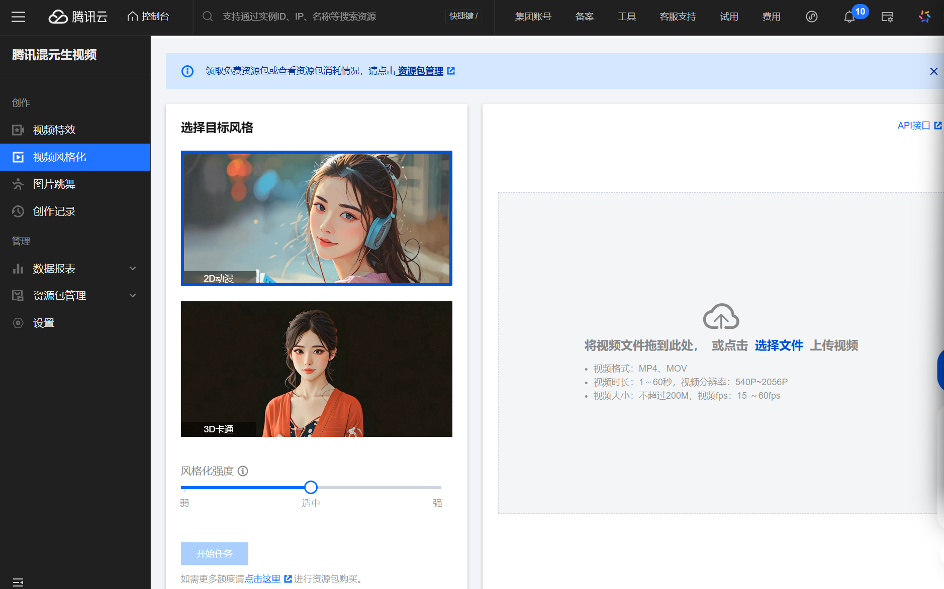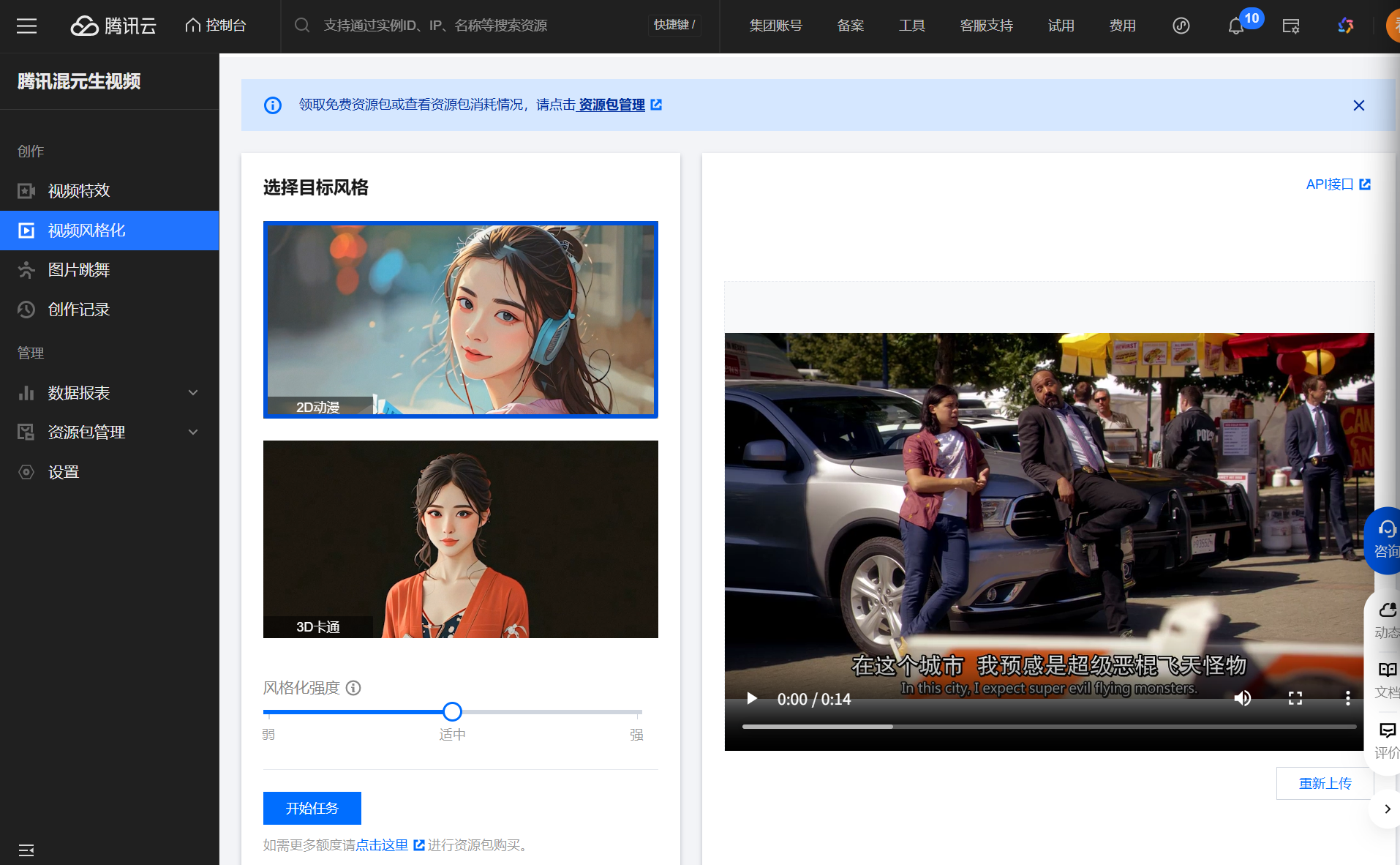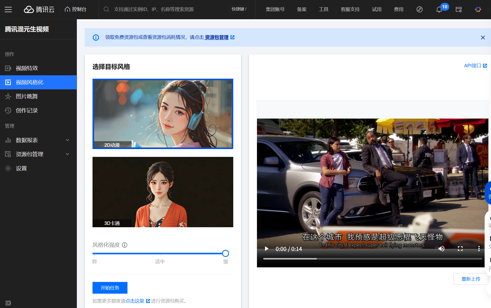 在腾讯云混元生视频控制台页面,点击切换到视频风格化页面
