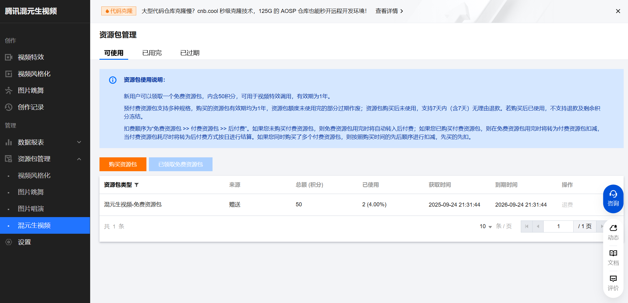 在管理--资源包管理--混元生视频页面,点击 领取免费资源包 按钮,可以领取一次免费资源包