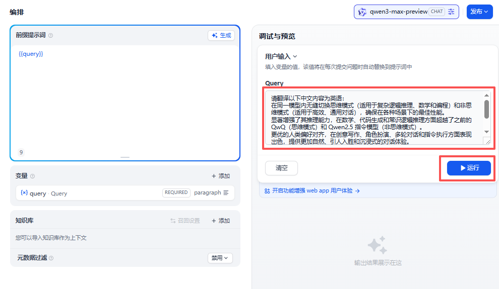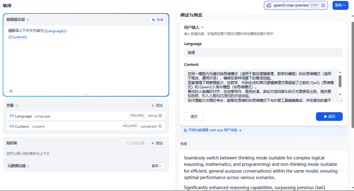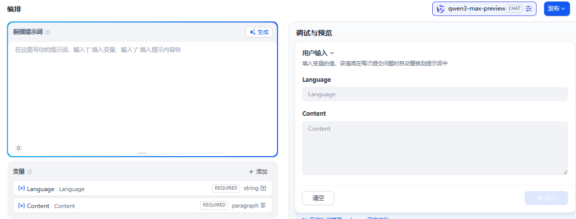 5. 填入前缀提示词。输入“{”会自动弹出菜单,列出所有定义好的变量 6. 同样的, 把要翻译的语言和内容填入相应栏里, 按“运行”,结果就出来了
