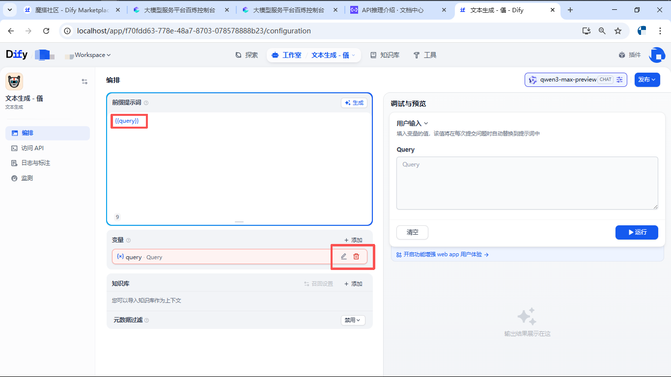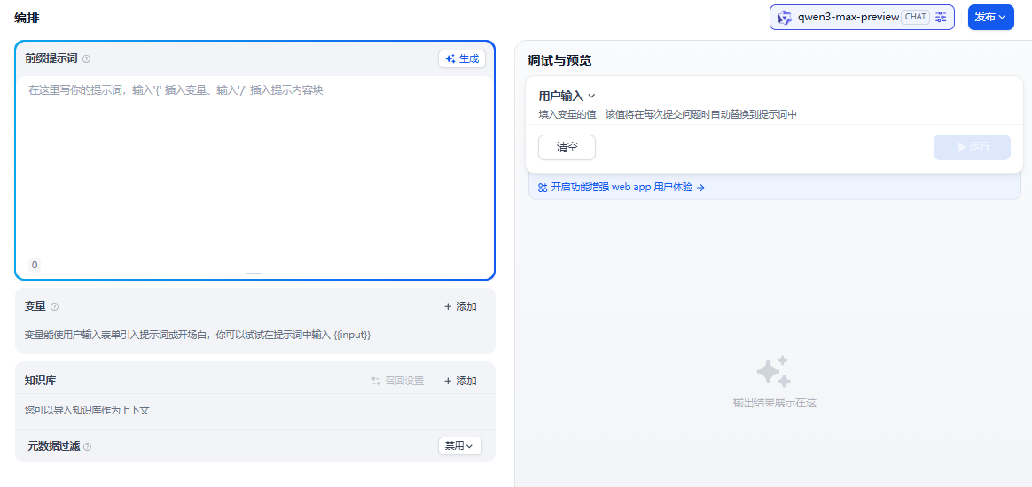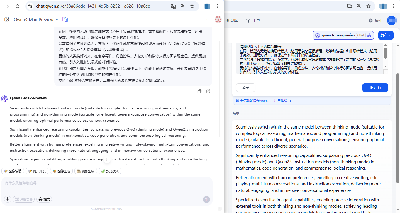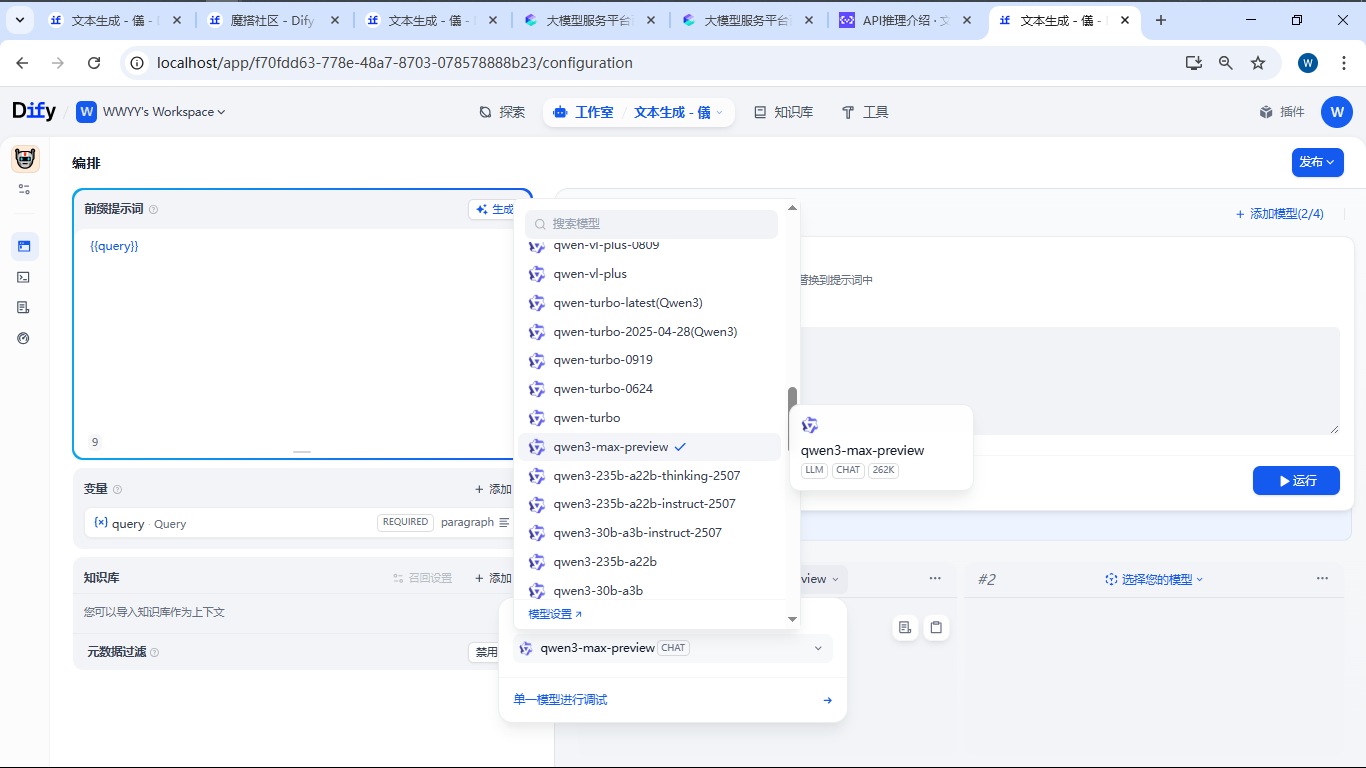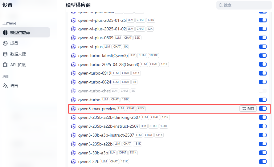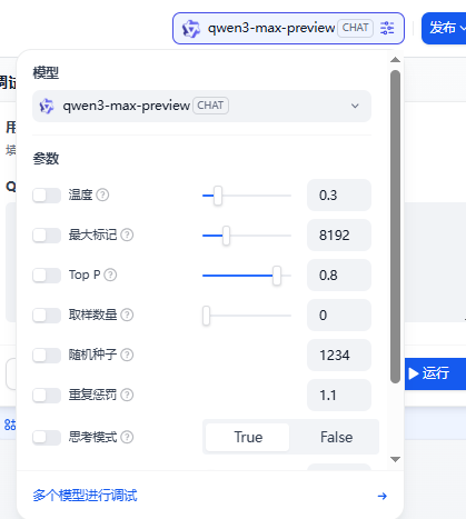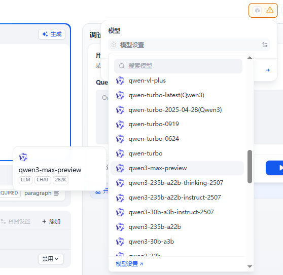 vii. 点右上角橘色小三角,”模型设置“,选一个模型,为方便对比, 此次选择Qwen3-max-Preview