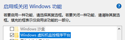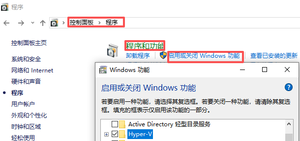 1. 控制面板 > 程序 > 启动或关闭Windows功能, 勾选 Hyper-V,Windows 虚拟机监控程序平台