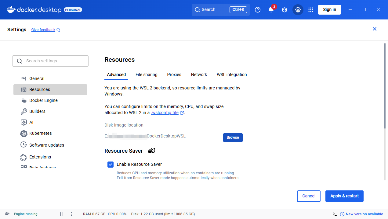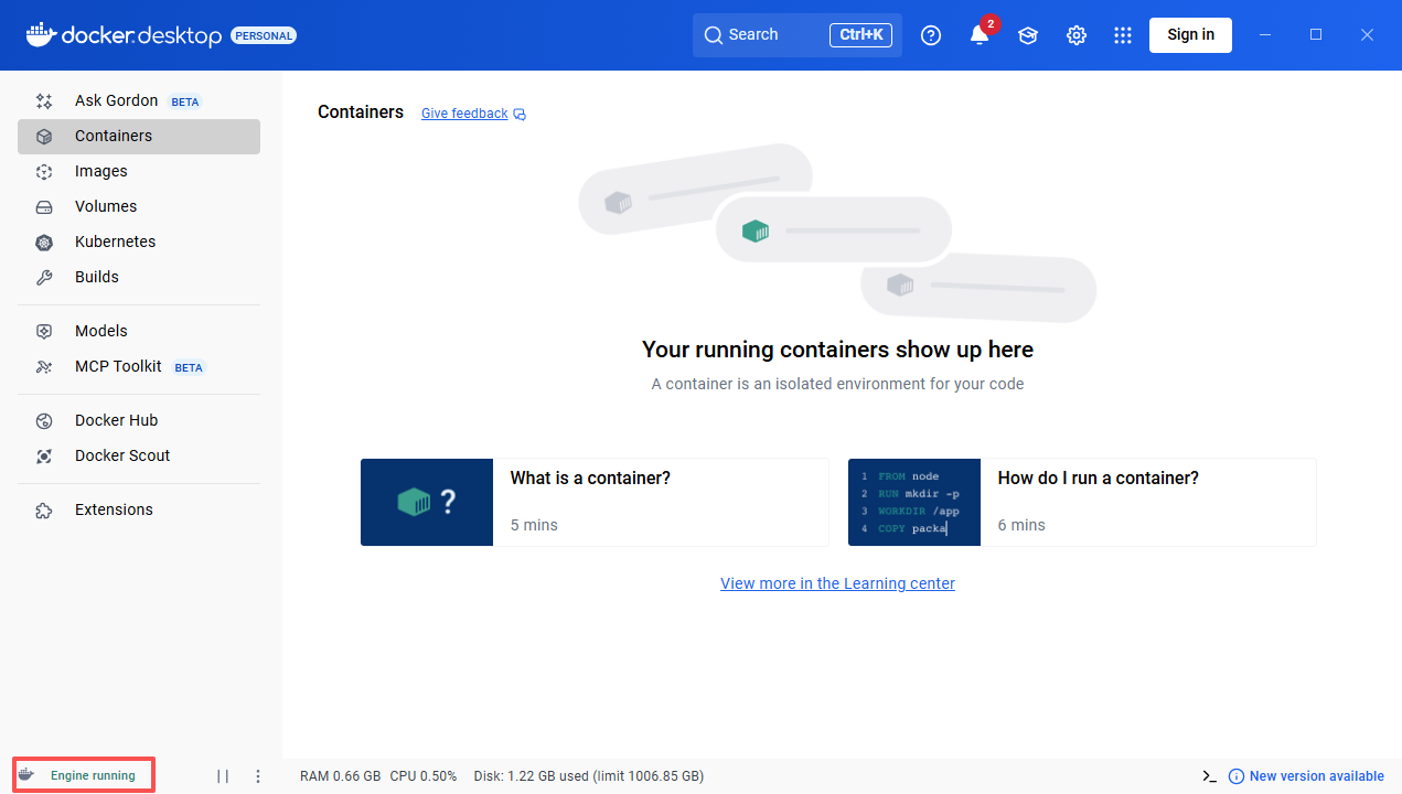 注: i. 启动Docker Desktop时不需要启动Ubuntu或WSL,开机后直接点开即可, ii. 第一次启动Docker Desktop 会出现一个登入页,不需要登入, 在右上角有个 “skip” 可以直接跳过(忘了截屏), iii. 左下角标注“Engine running" 方为成功。
