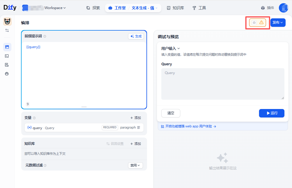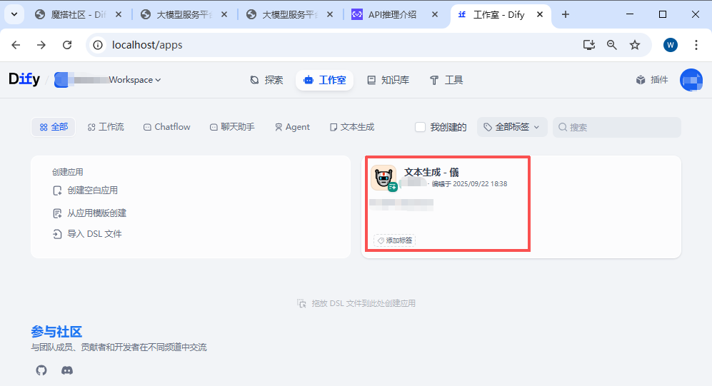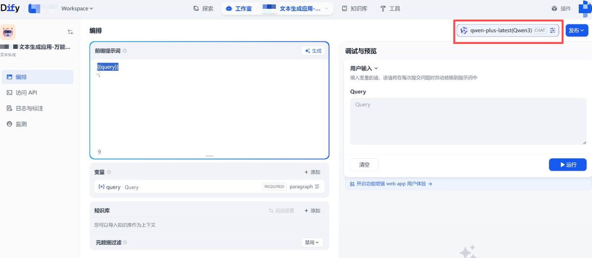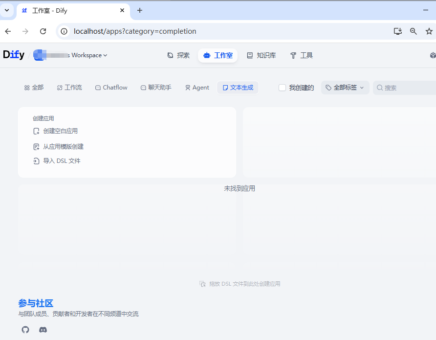 1. 进入Dify 主页,选择"工作室" > "创建空白应用"
