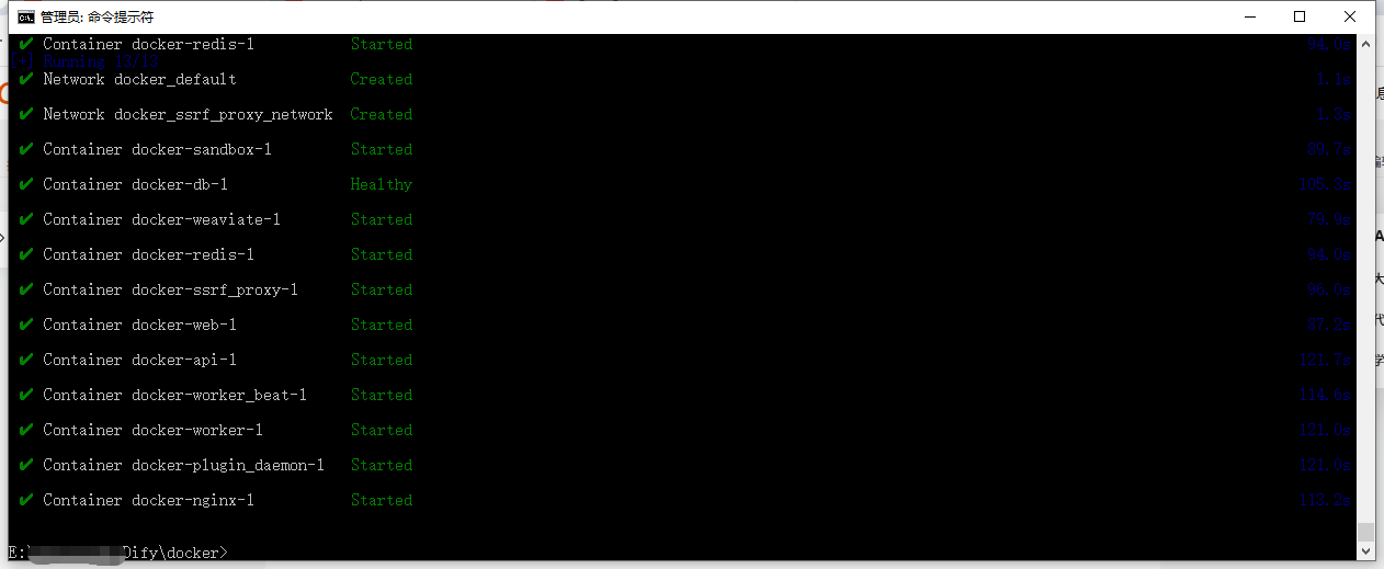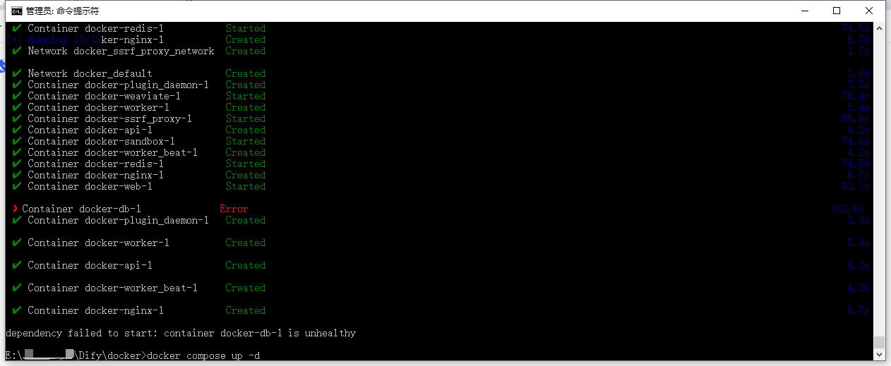 3. 开一个管理员权限的命令提示窗(cmd),在《自选路径》/docker 路径下,shell 执行:docker compose up -d, 约 半小时下载后, 报错如下: