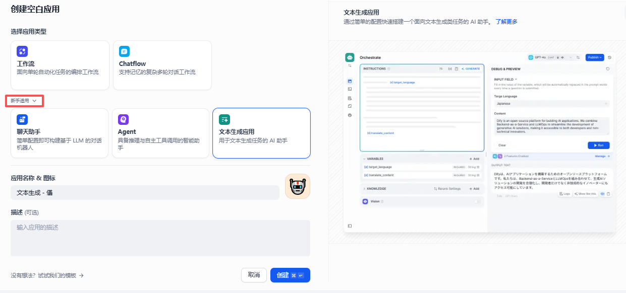 2. 点开“新手使用 >",选择 "文本生成应用", 填入信息,点击“创建”