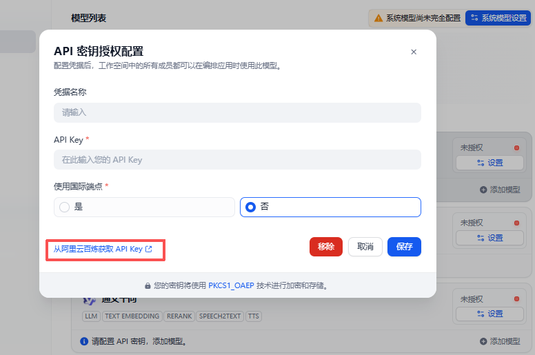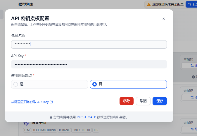 5. 回到本地 Dify, 填写API-Key, 不是国际端点, 保存。